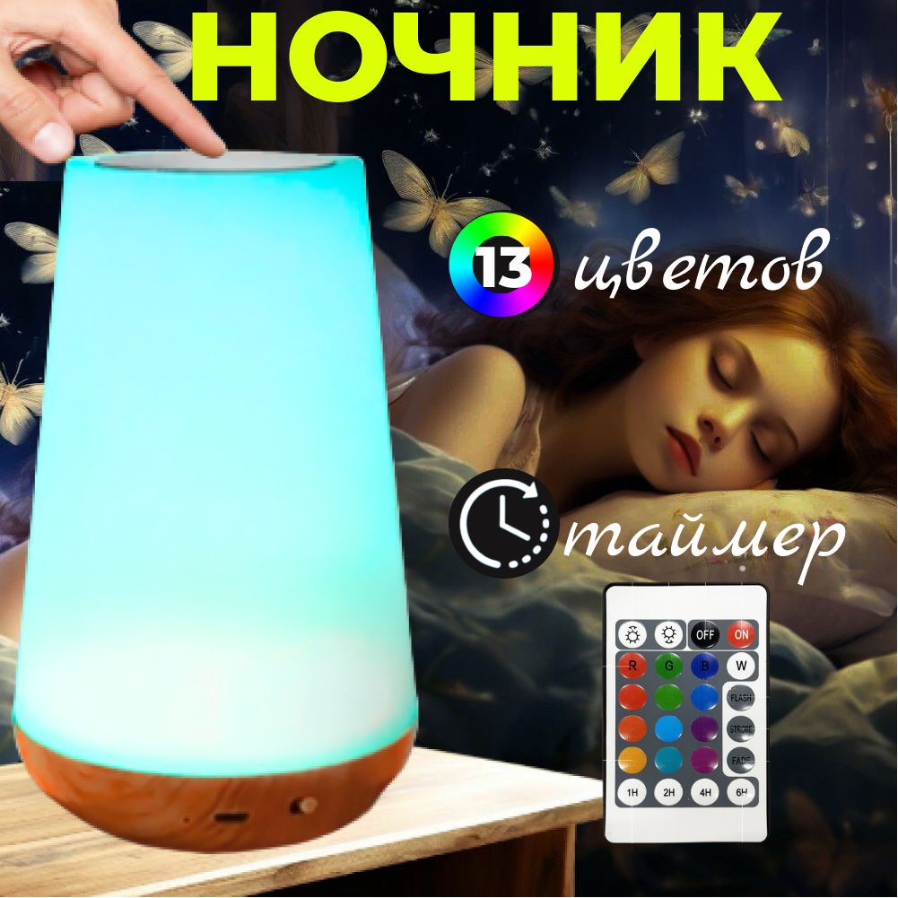 Светильник прикроватный настольный сенсорный, светодиодный беспроводной с пультом управления, детский ночник с таймером отключения 1 269 ₽