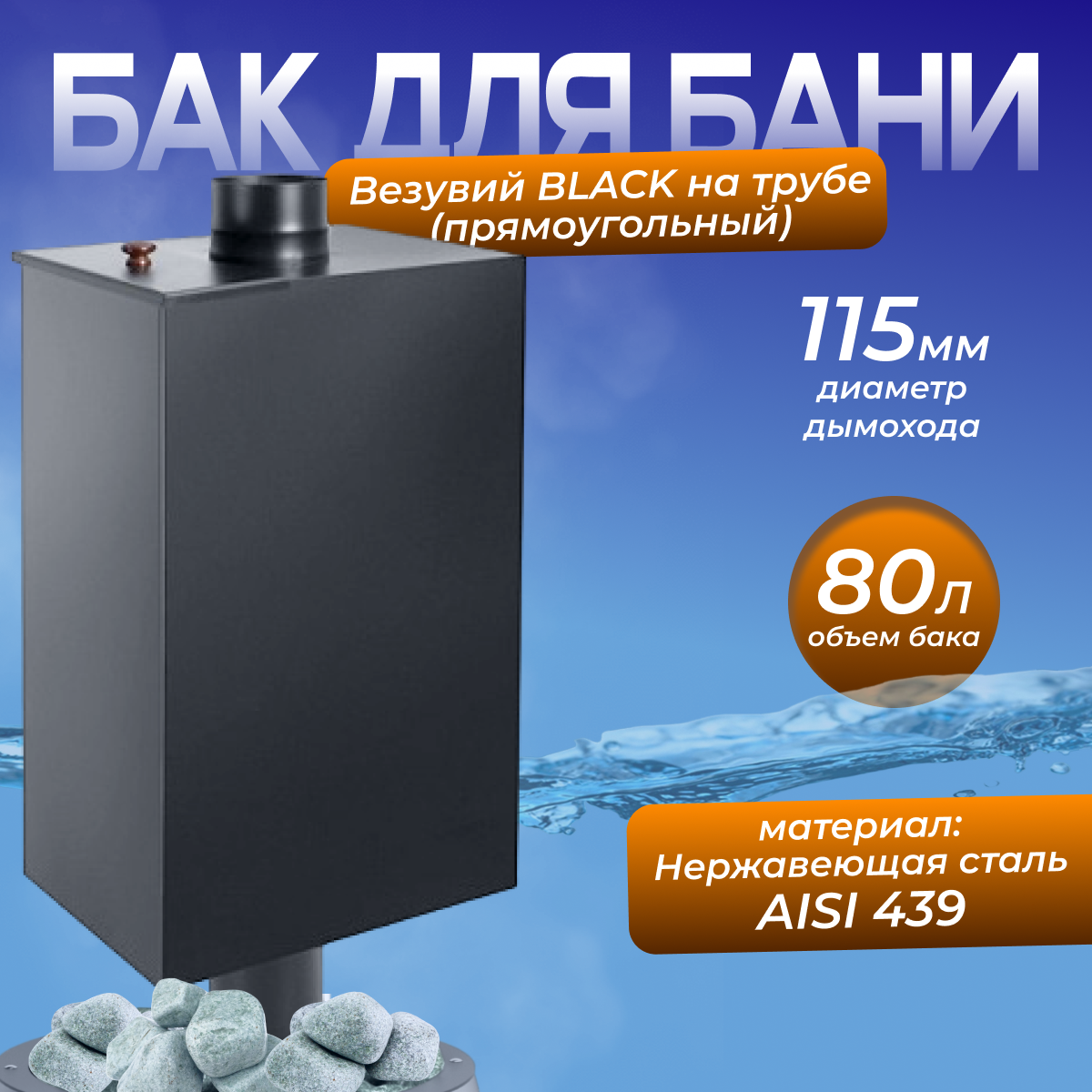 Бак BLACK на трубе 80л д.115 (Прямоугольный) (AISI 439) информация:
