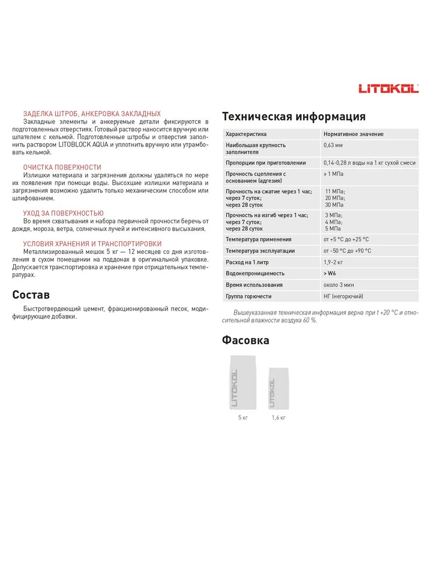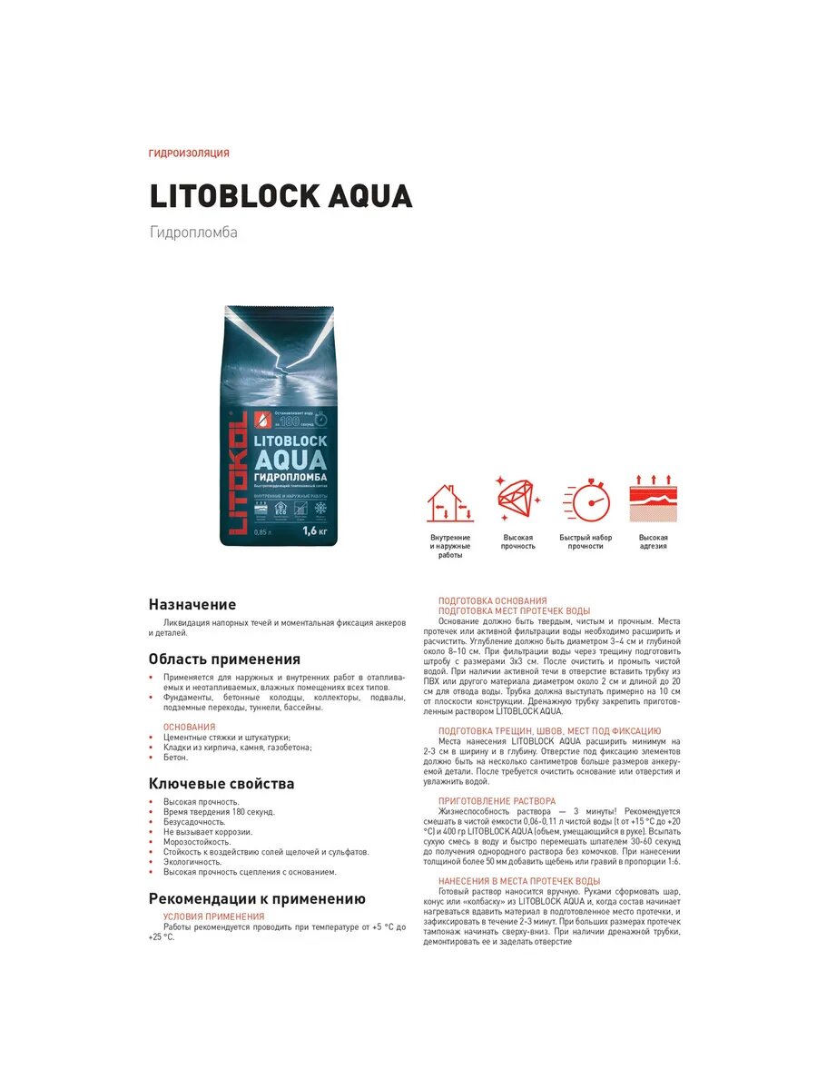 Смесь сухая гидроизоляционная Litokol LITOBLOCK AQUA 1,6кг информация: