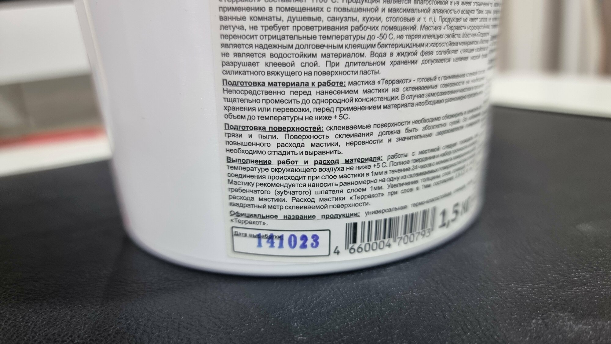 | Расход | Расход мастики «Терракот» при слое в 1 мм составляет 0,8-1,3 кг на 1 квадратный метр склеиваемой поверхности. |
