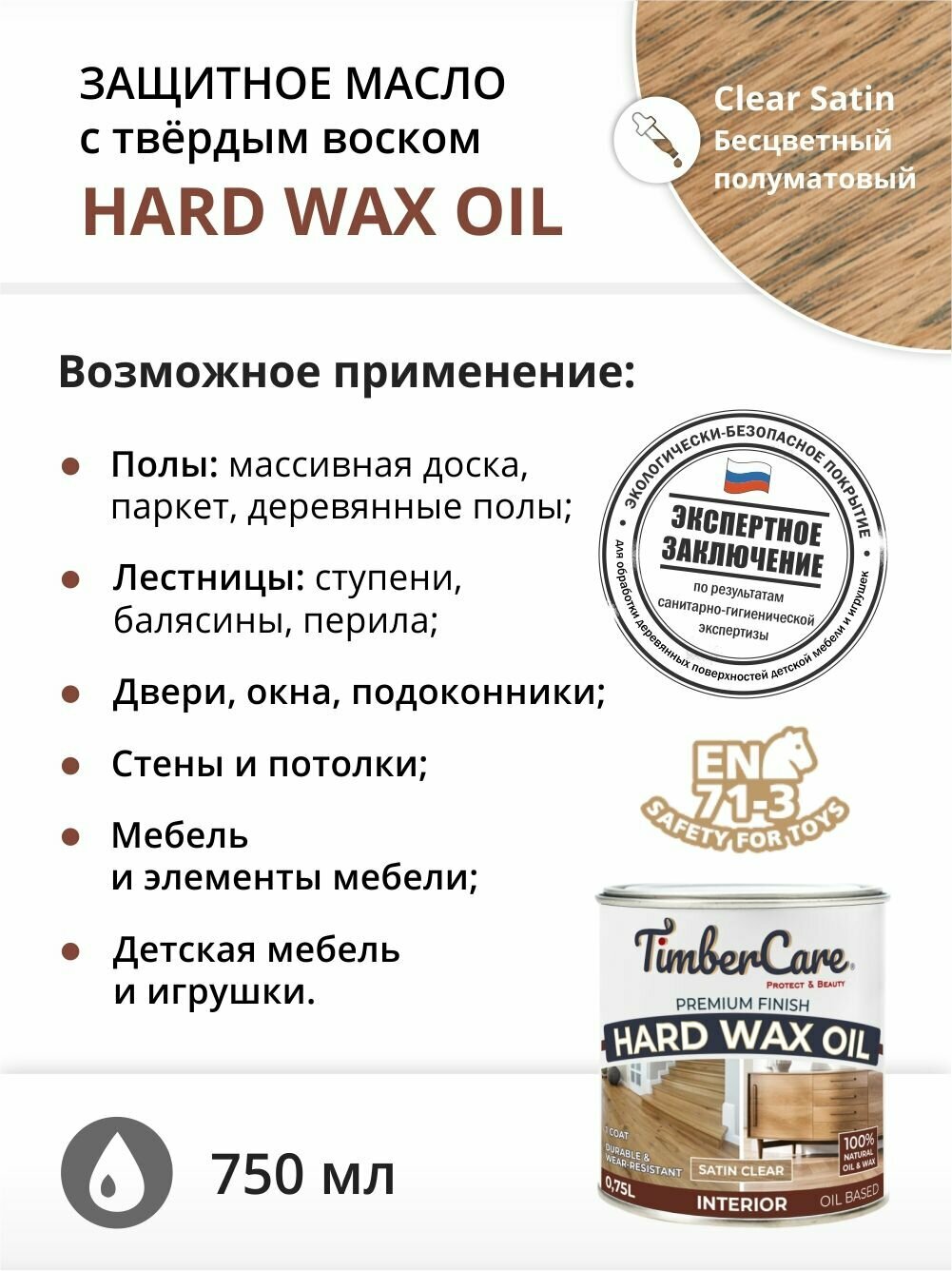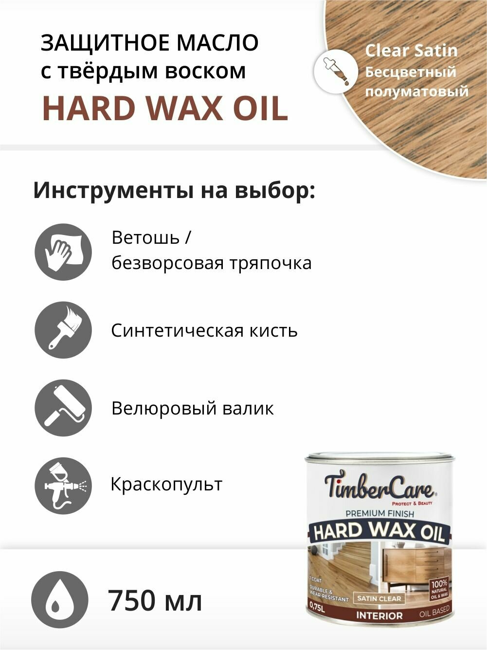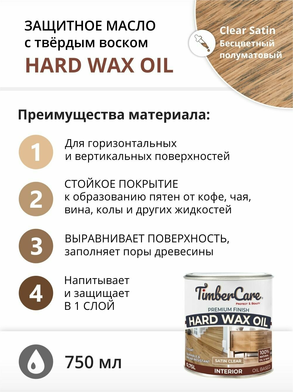 Масло для дерева и мебели с твердым воском TimberCare Hard Wax Color Oil, быстросохнущие для внутренних работ, Прозрачное полуматовое (satin), 0.75 л информация:
