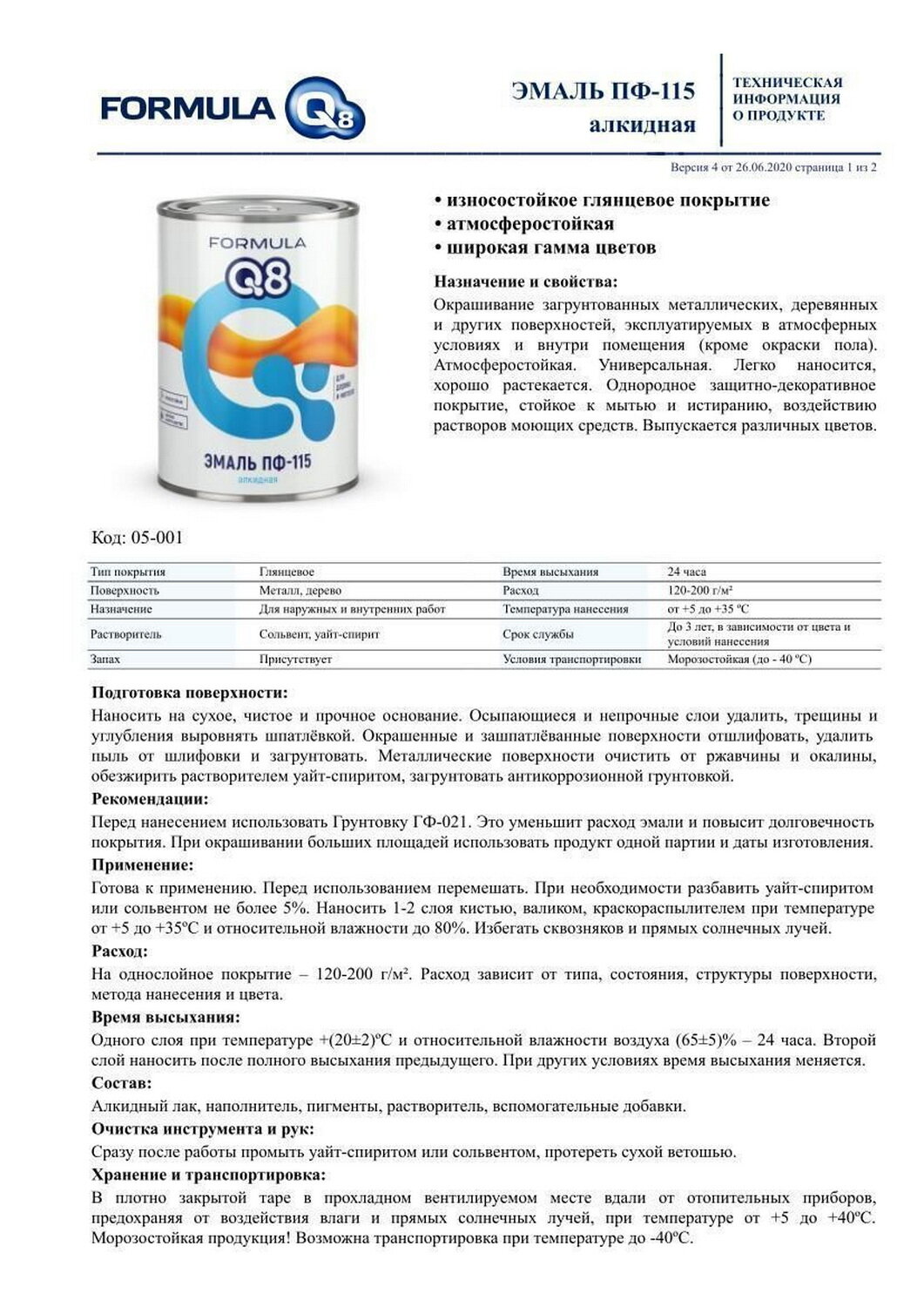 Эмаль ПФ-115 алкидная Formula Q8, глянцевая, 0,9 кг, черная, 1шт, металлическая банка