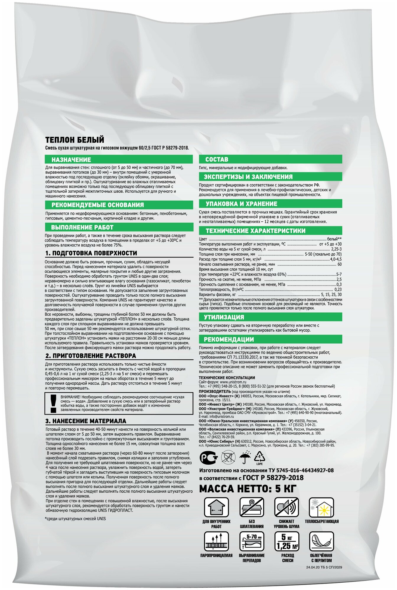 Штукатурка гипсовая UNIS теплон белый, 5кг информация: