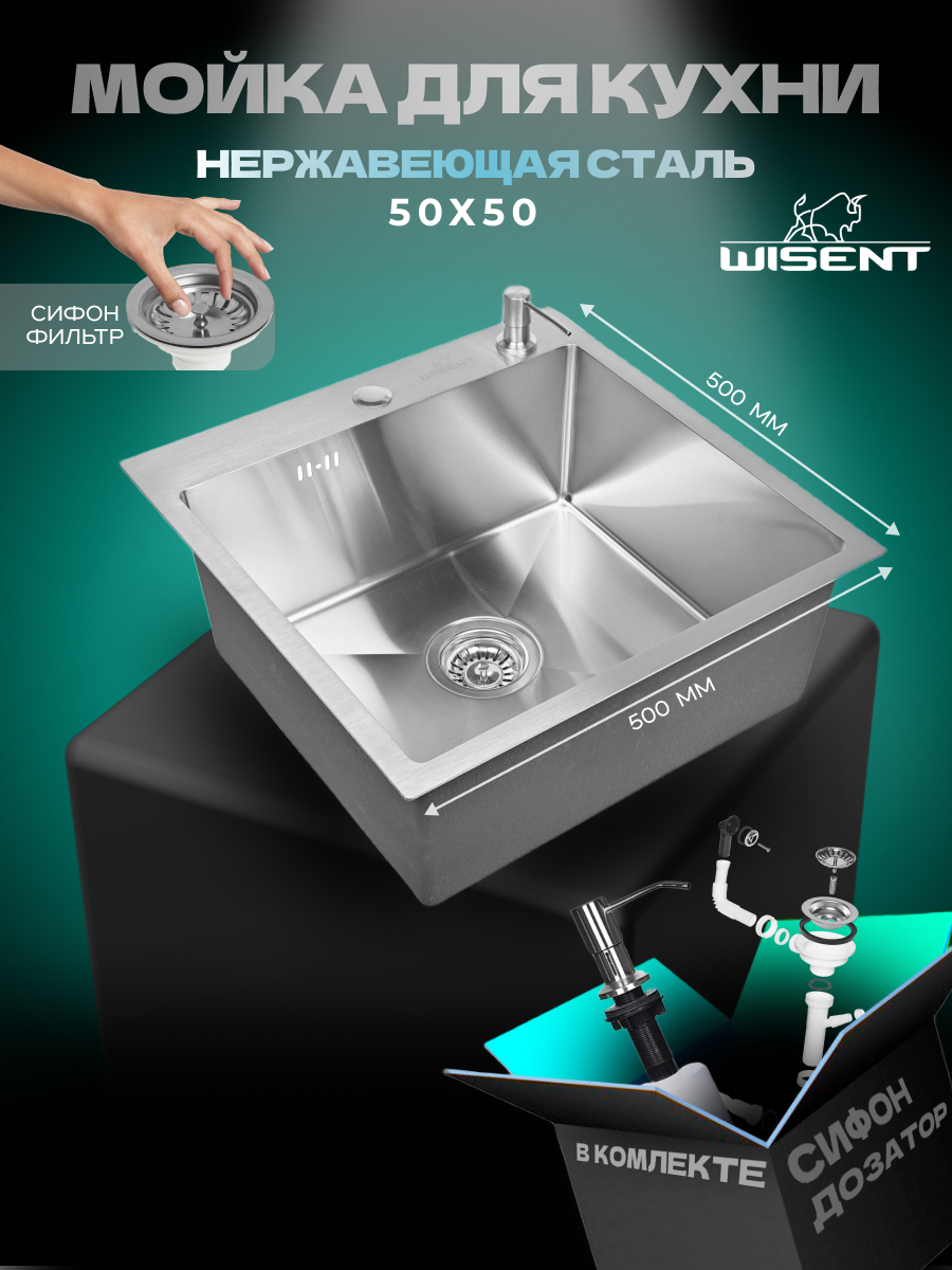Отзывы на Комплект мойка для кухни нержавеющая врезная 50*50 с дозатором Wisent WGS35050/W405B/WGER010