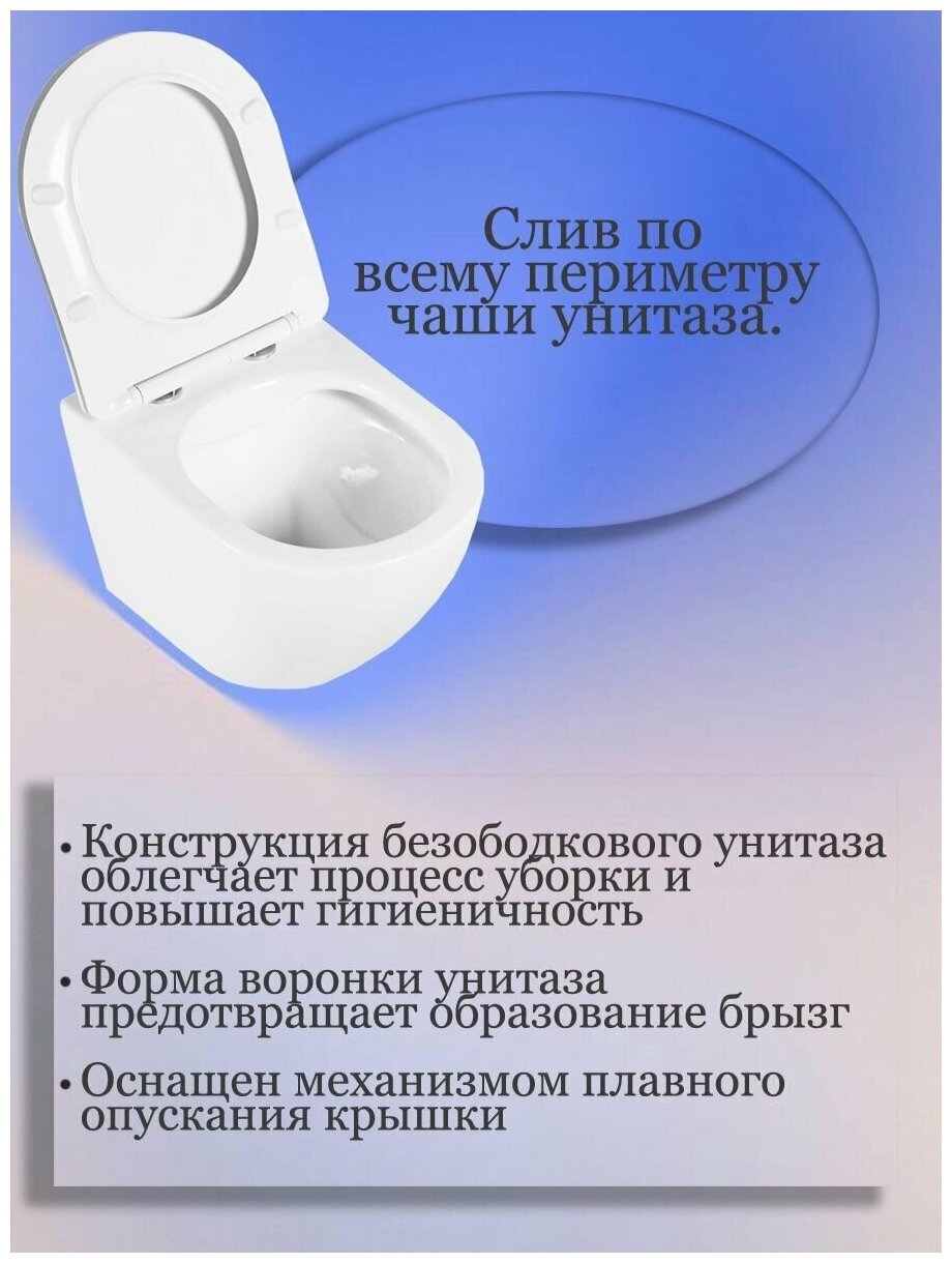 | Дополнительная информация | быстросъемное сиденье «soft close»; материал сиденья - дюропласт; режим и механизм слива определяется системой инсталляции |