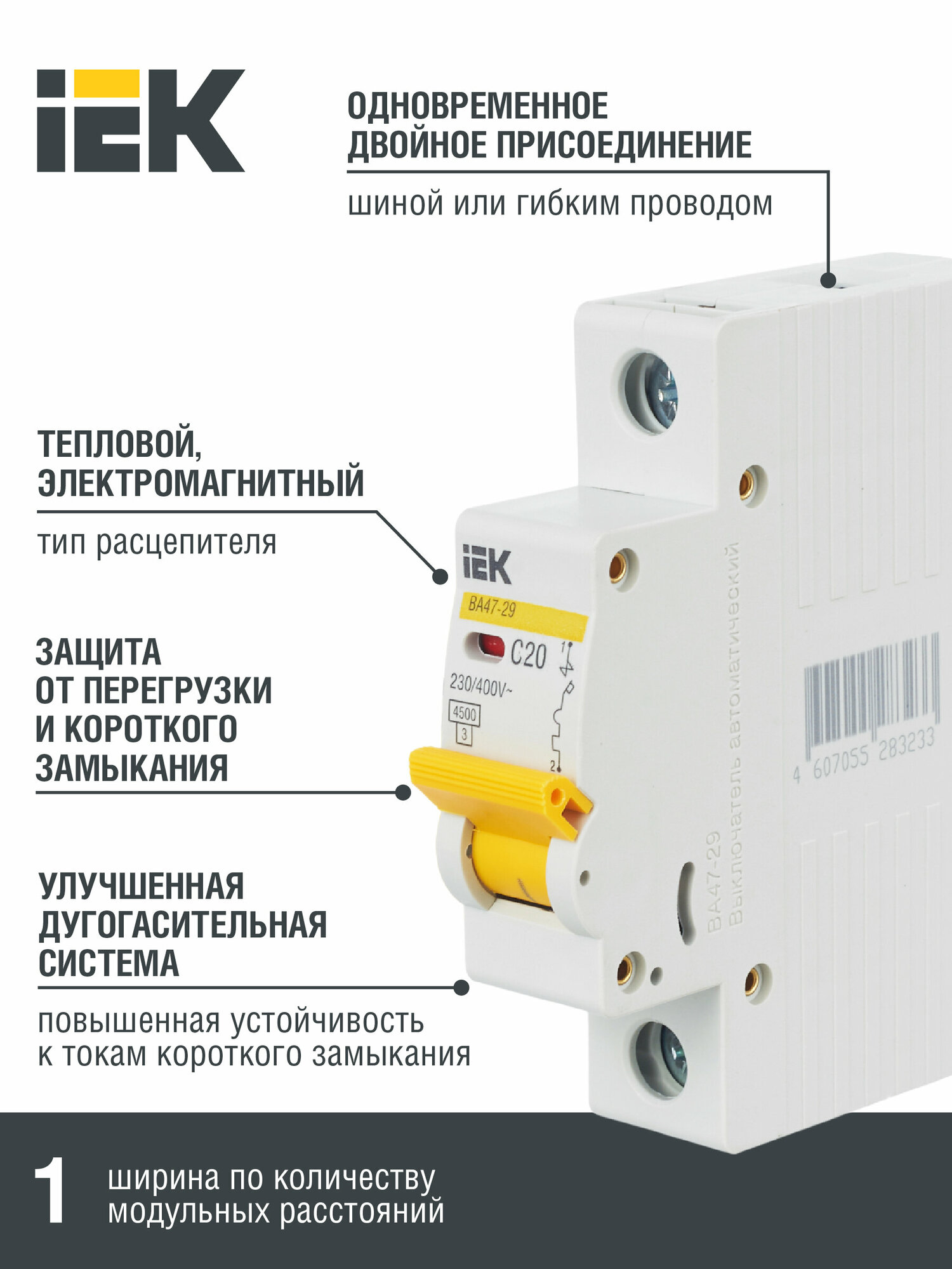 Автоматический выключатель IEK ВА47-29 1п, 20А, "С", 4.5кА MVA20-1-020-C информация: