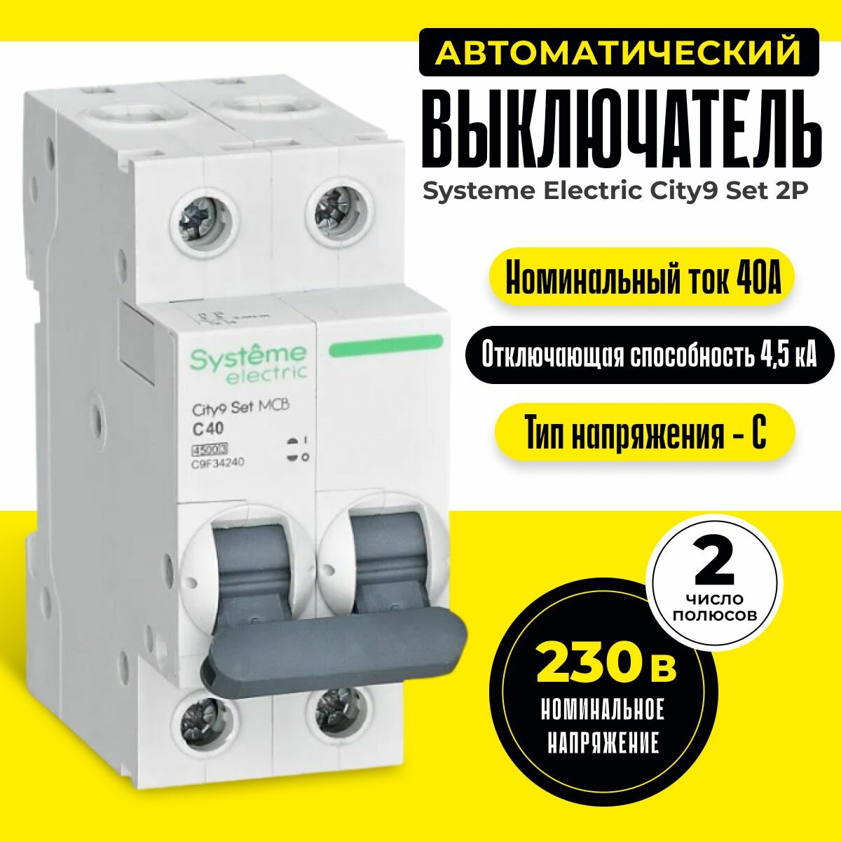 Выключатель автоматический двухполюсный 40А С 4.5kA 230В City9 информация: