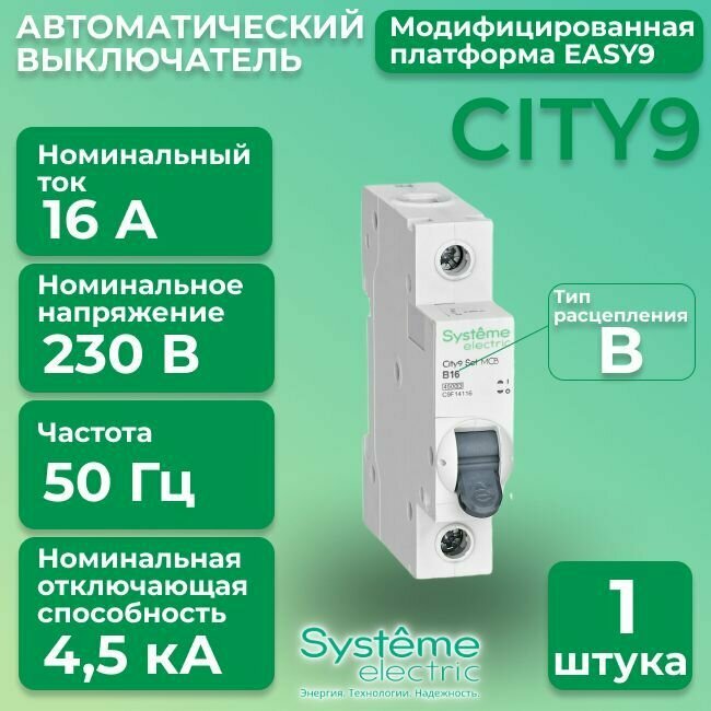 Автоматический выключатель Systeme Electric 1P 16А тип В 4,5кА City9 Set C9F14116 / аналог EZ9F14116 - 1 шт. информация: