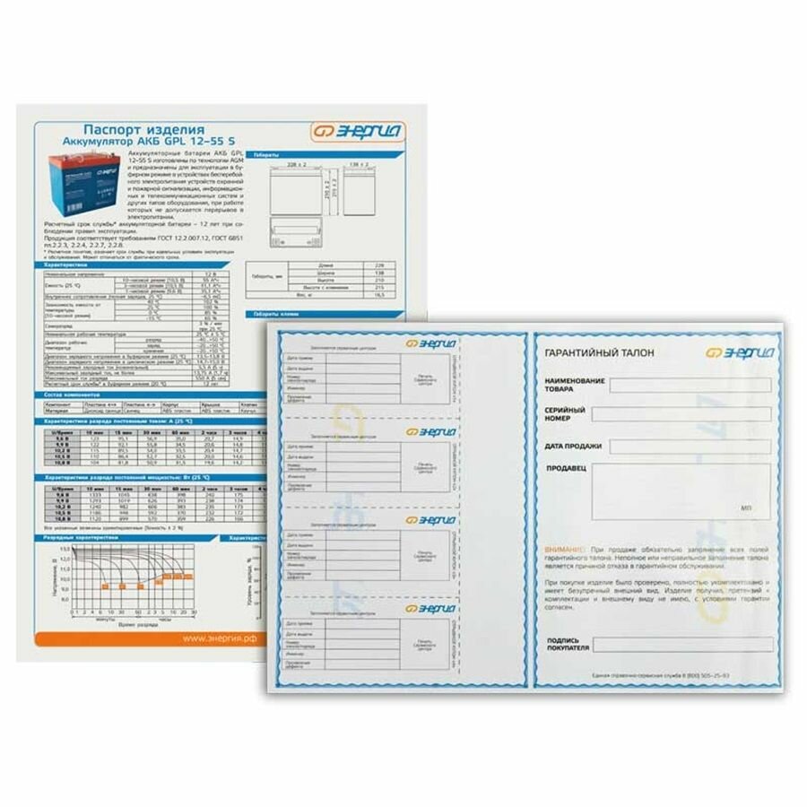 Аккумулятор Энергия GPL 12-55 S, 12V, 55Ач, AGM информация: