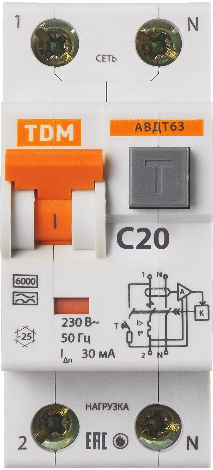 АВДТ 63 2Р(1Р+N) C20 30мА 6кА тип А TDM информация: