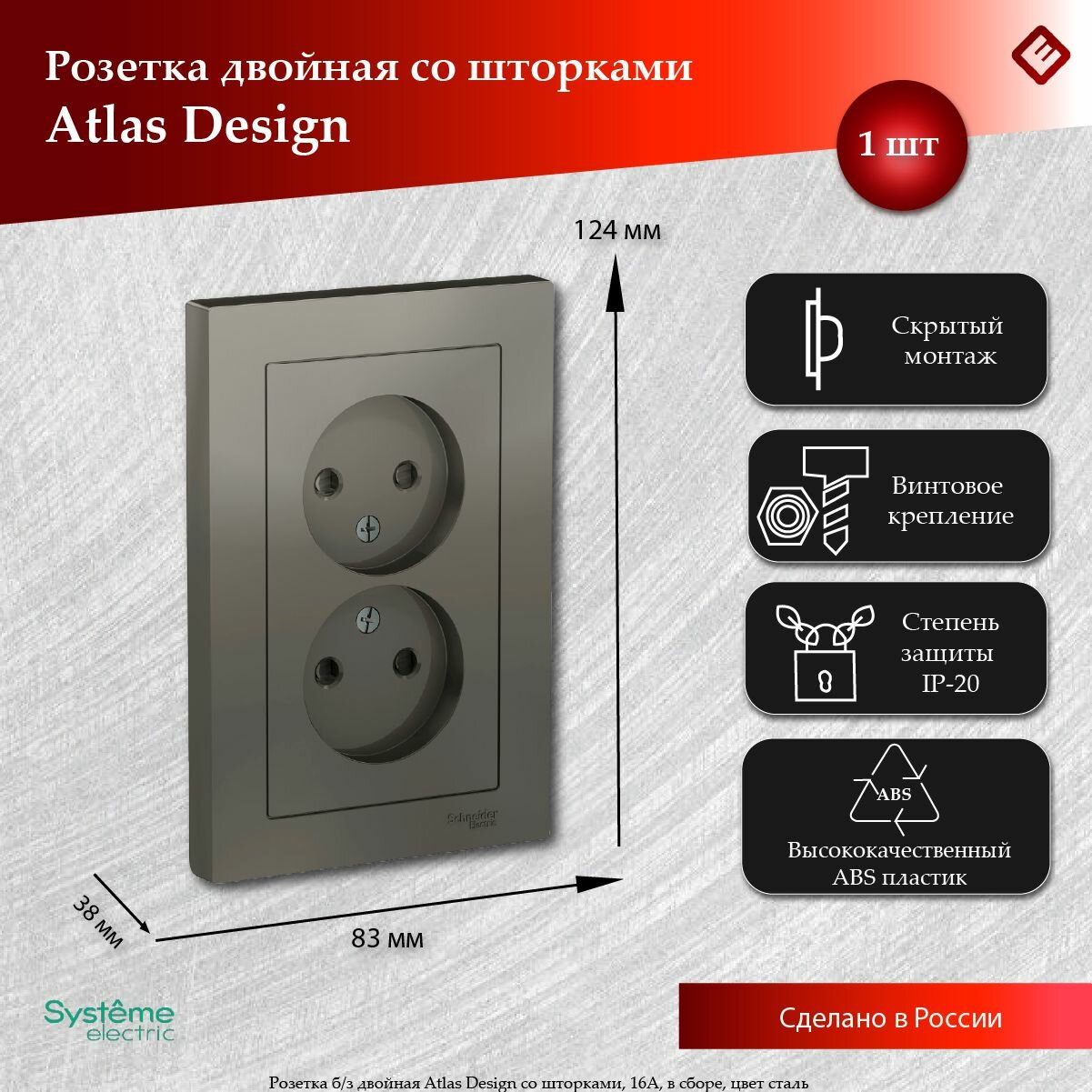 Розетка двойная сталь, без заземления, со шторками,16А, в сборе, Schneider Electric AtlasDesign информация: