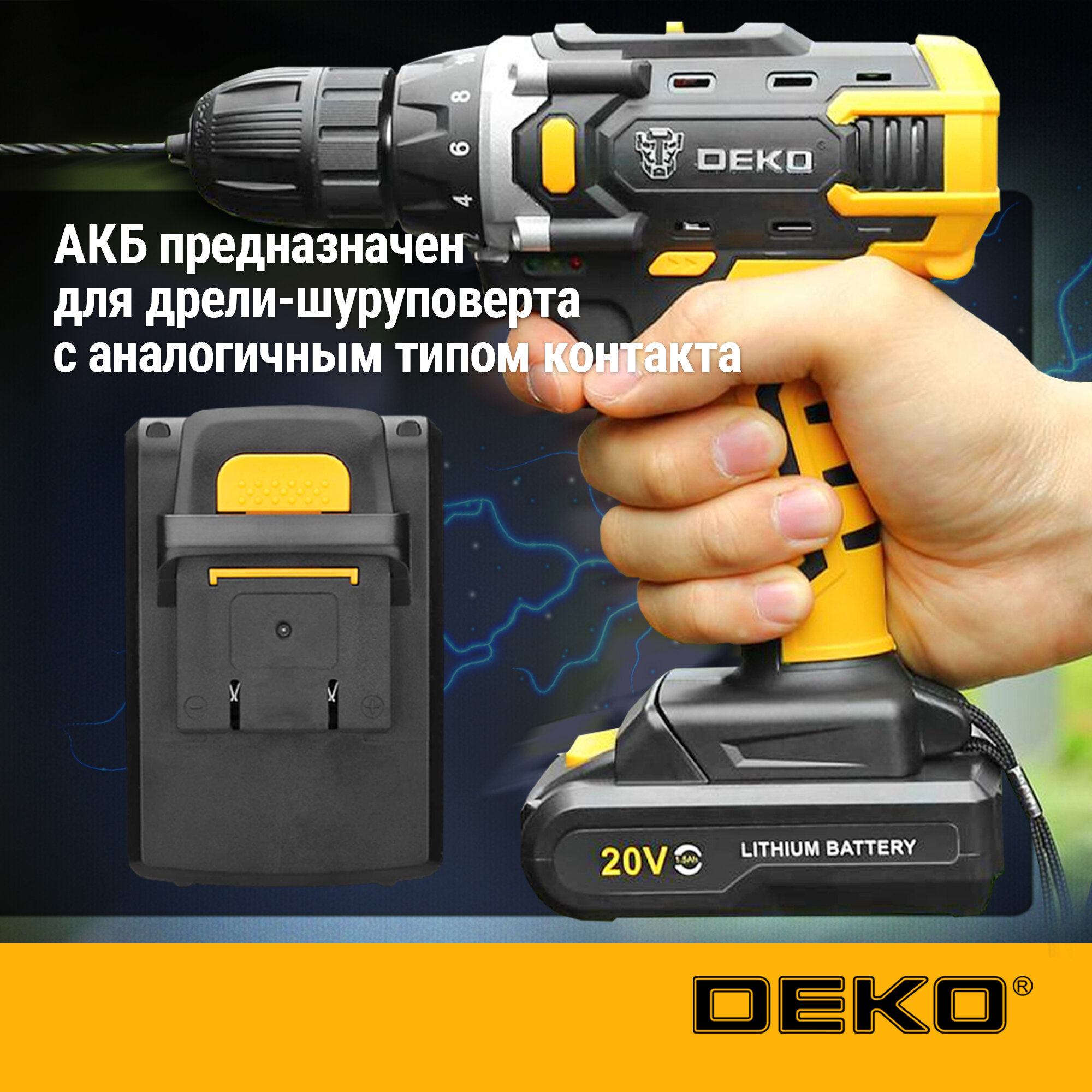 Аккумулятор DEKO для дрели-шуруповерта DKCD20FU-Li, 20В, 1,5А*ч информация: