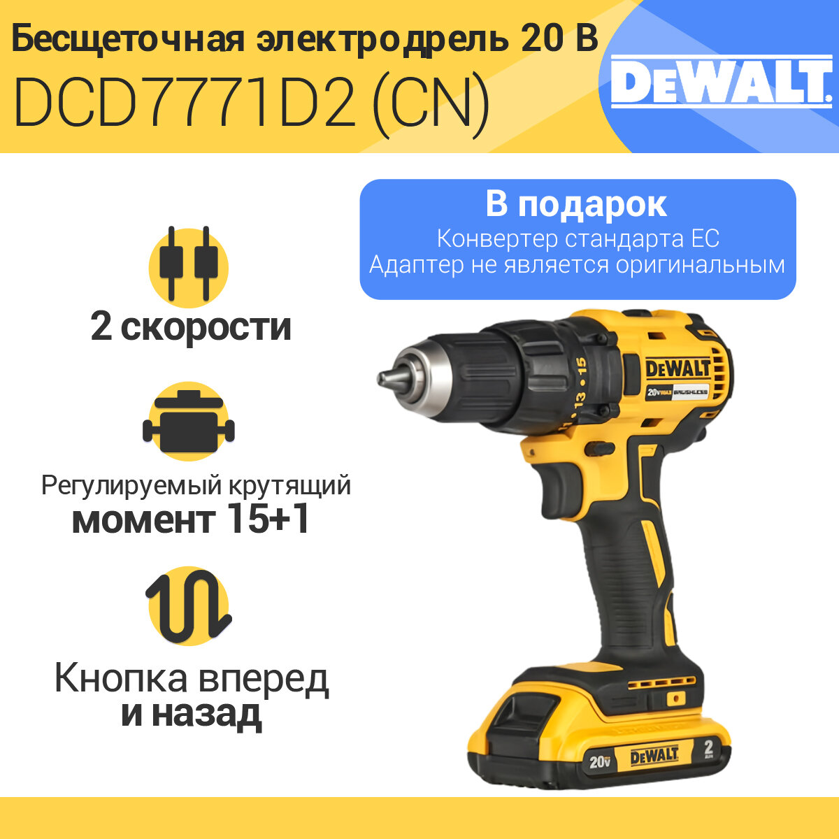 Шуруповерт аккумуляторный DeWalt DCD7771D2 20В 2х2Ач Li-Ion, CN информация: