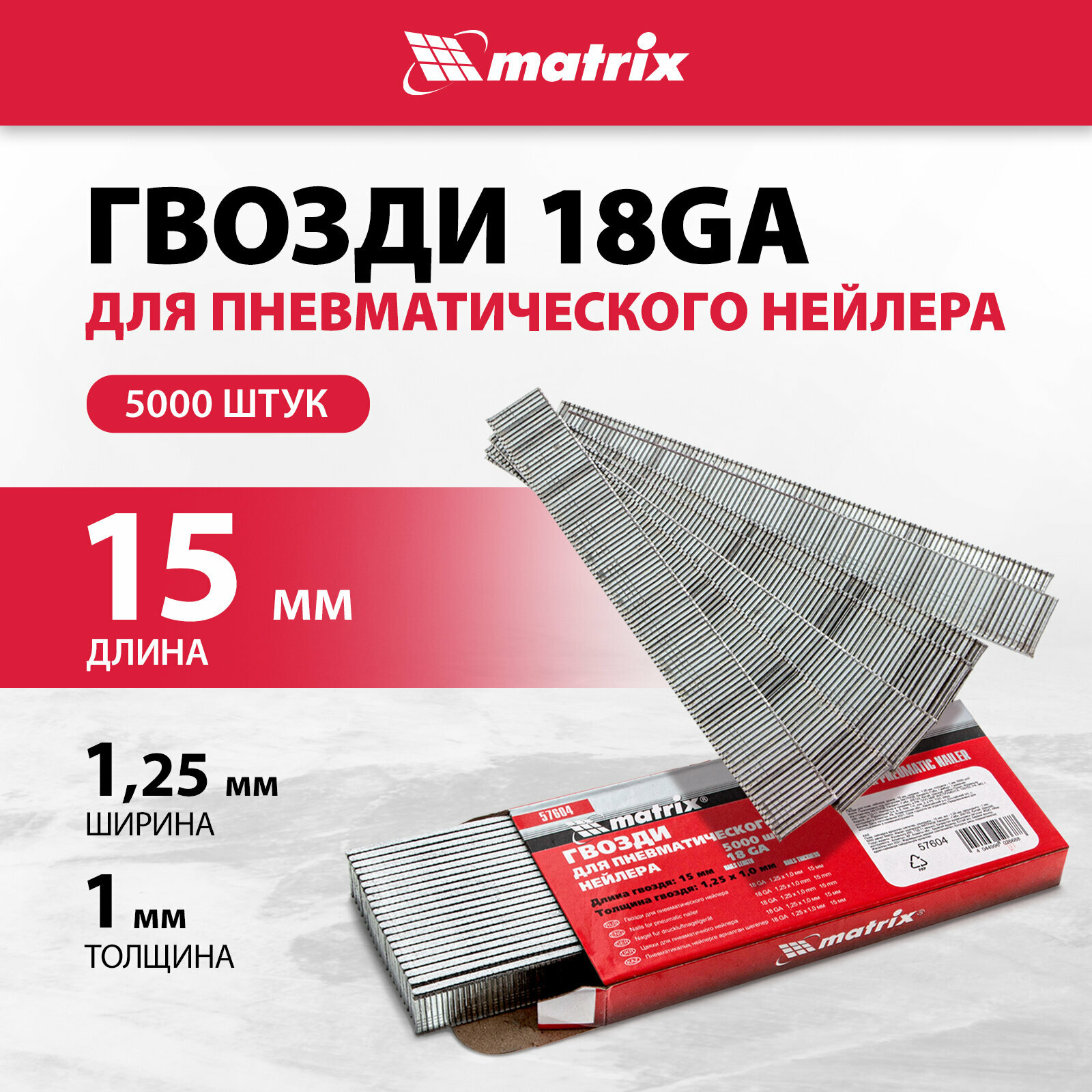 Гвозди 18GA для пневматического нейлера, длина 15 мм, ширина 1.25 мм, толщина 1 мм, 5000 шт Matrix