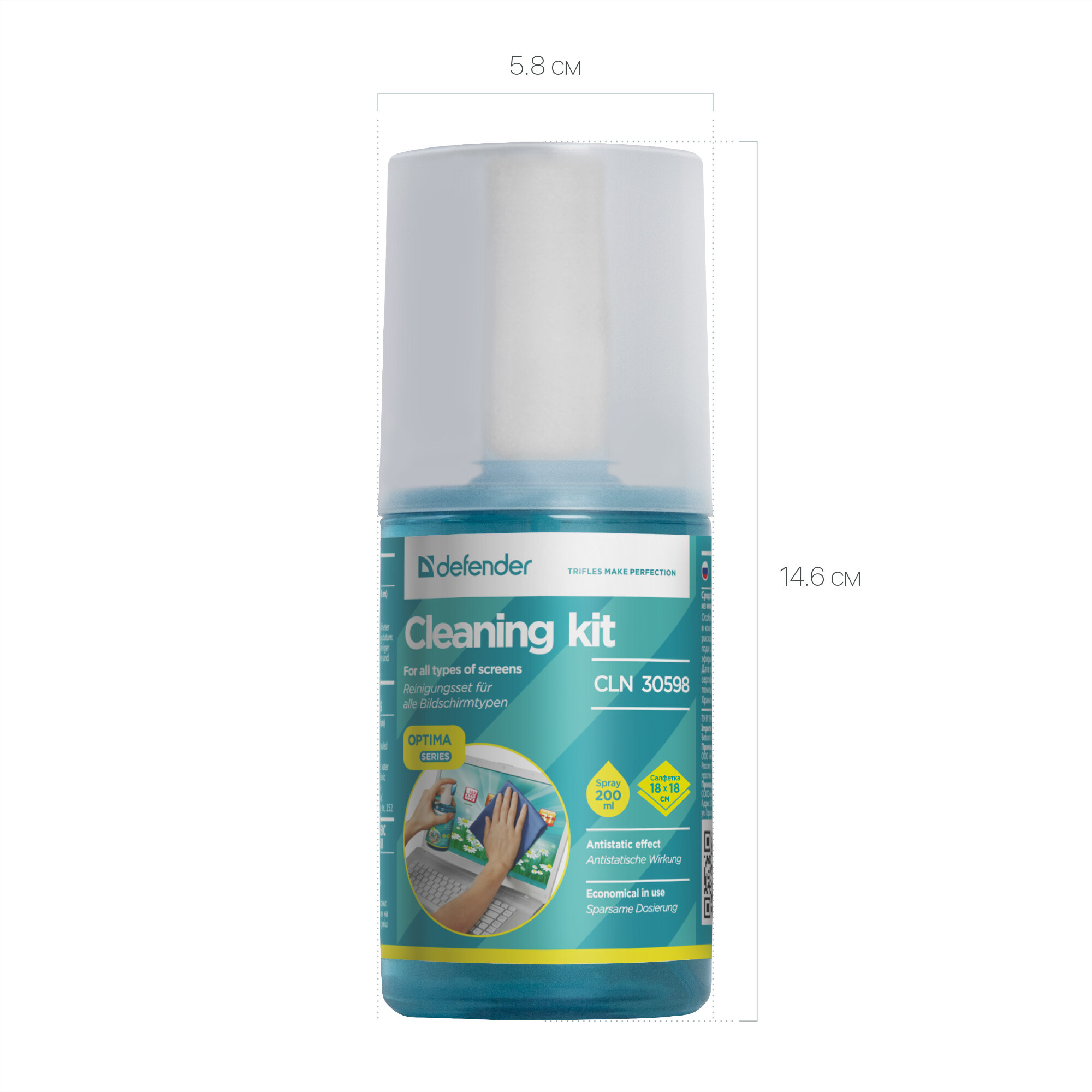 Очищающий комплекс: салфетка из микрофибры + чистящее средство Defender CLN Optima 200 мл , для экрана , монитора , телефона , оптики и стекол информация: