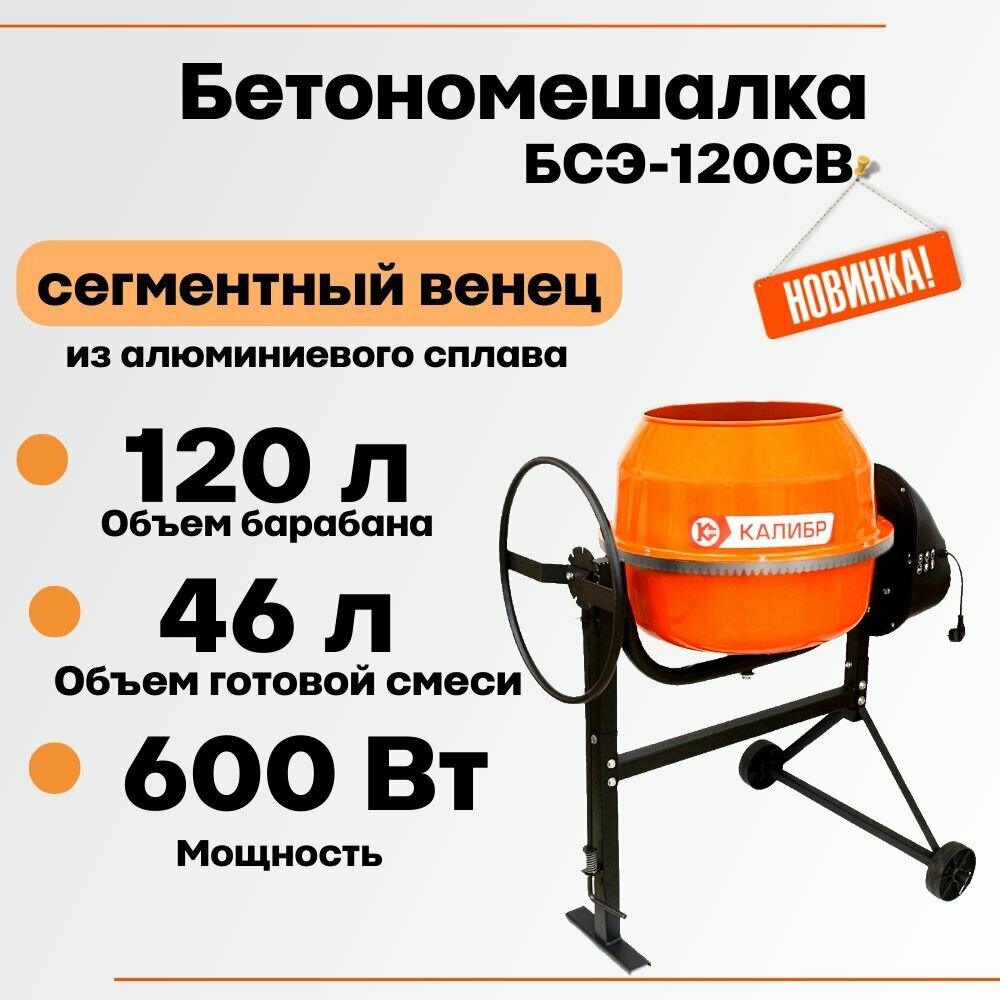 Бетоносмеситель Калибр БСЭ-120СВ сегментный венец из алюминиевого сплава, объем 120 литров, мощность 600 Вт, бетономешалка строительная информация: