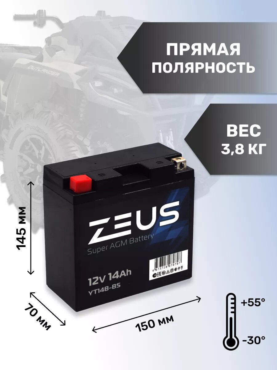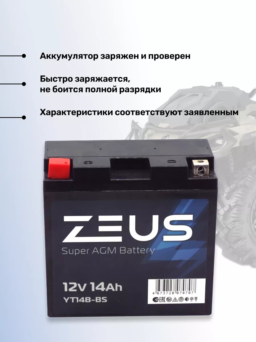 Отзывы на Аккумулятор стартерный гелевый для мотоцикла/квадроцикла/скутера ZEUS SUPER AGM 14 Ач п.п. (YT14B-BS)