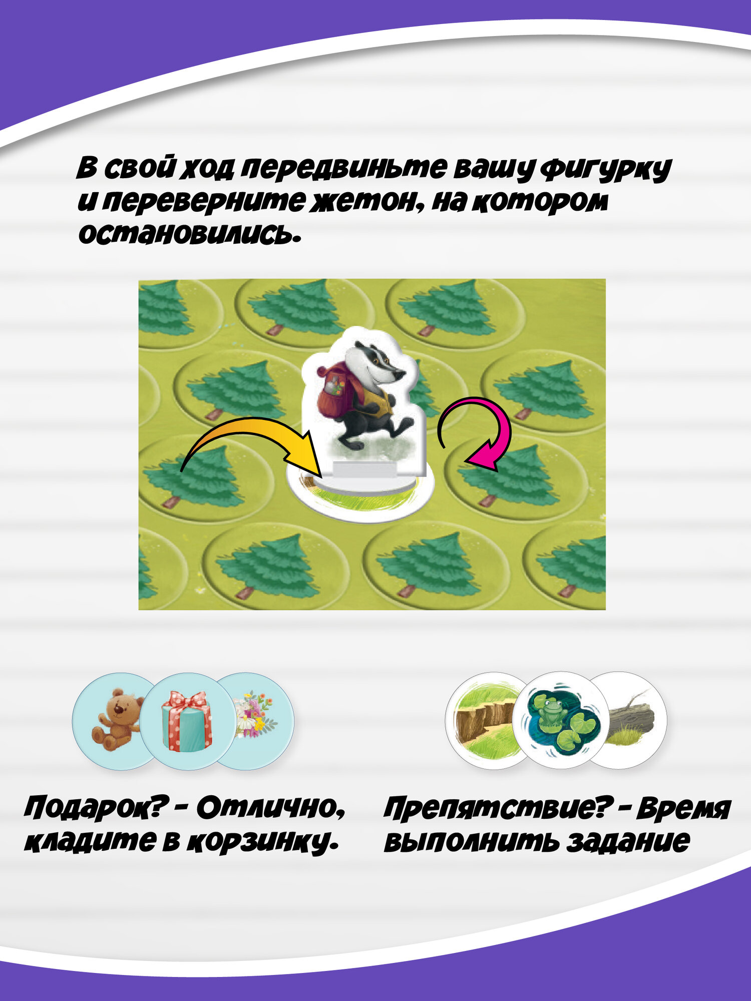 | Комплектация | 5 фигурок животных с подставками, 4 планшета героев, 4 части игрового поля, 30 жетонов леса трёх видов, 30 карточек заданий, правила игры |