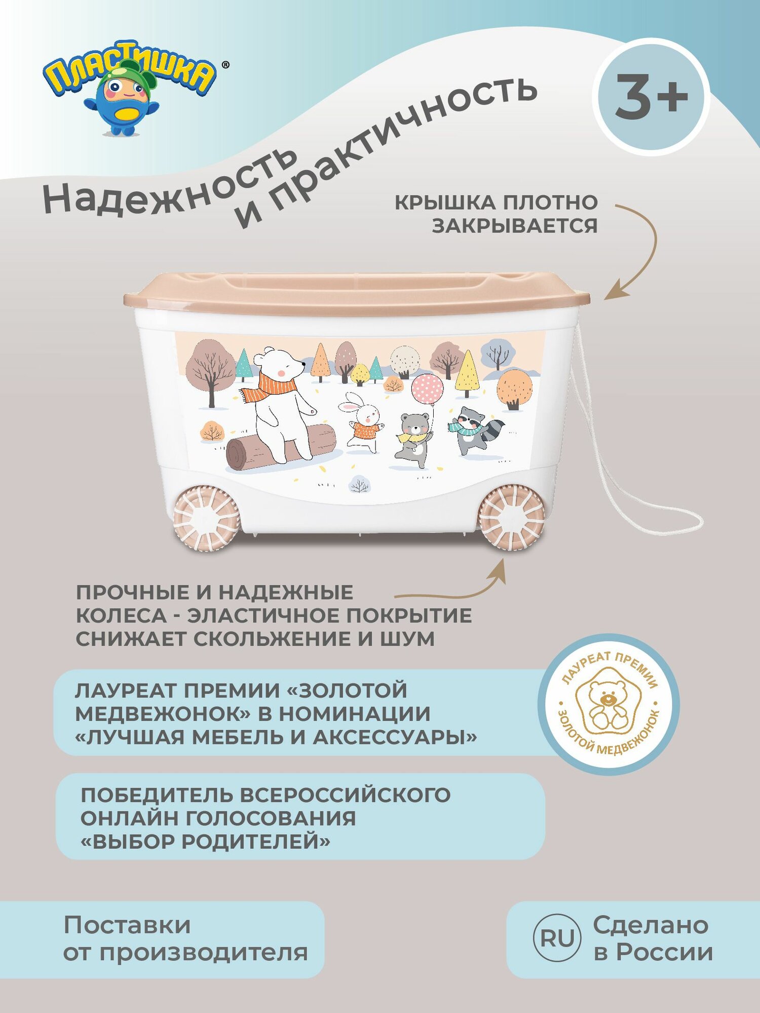 Ящик для игрушек Пластишка на колесах, с декором "Зверушки на опушке" 580х390х335 мм, 45 л, темно-бежевый (43138093251)