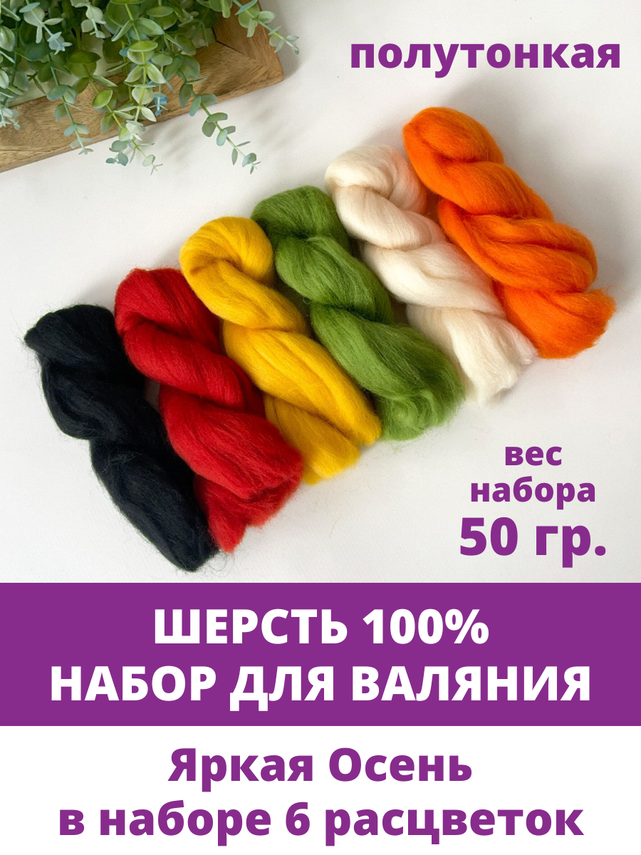 Шерсть для валяния, Яркая осень, полутонкая шерсть 100 %, набор 6 цветов, 50 г информация: