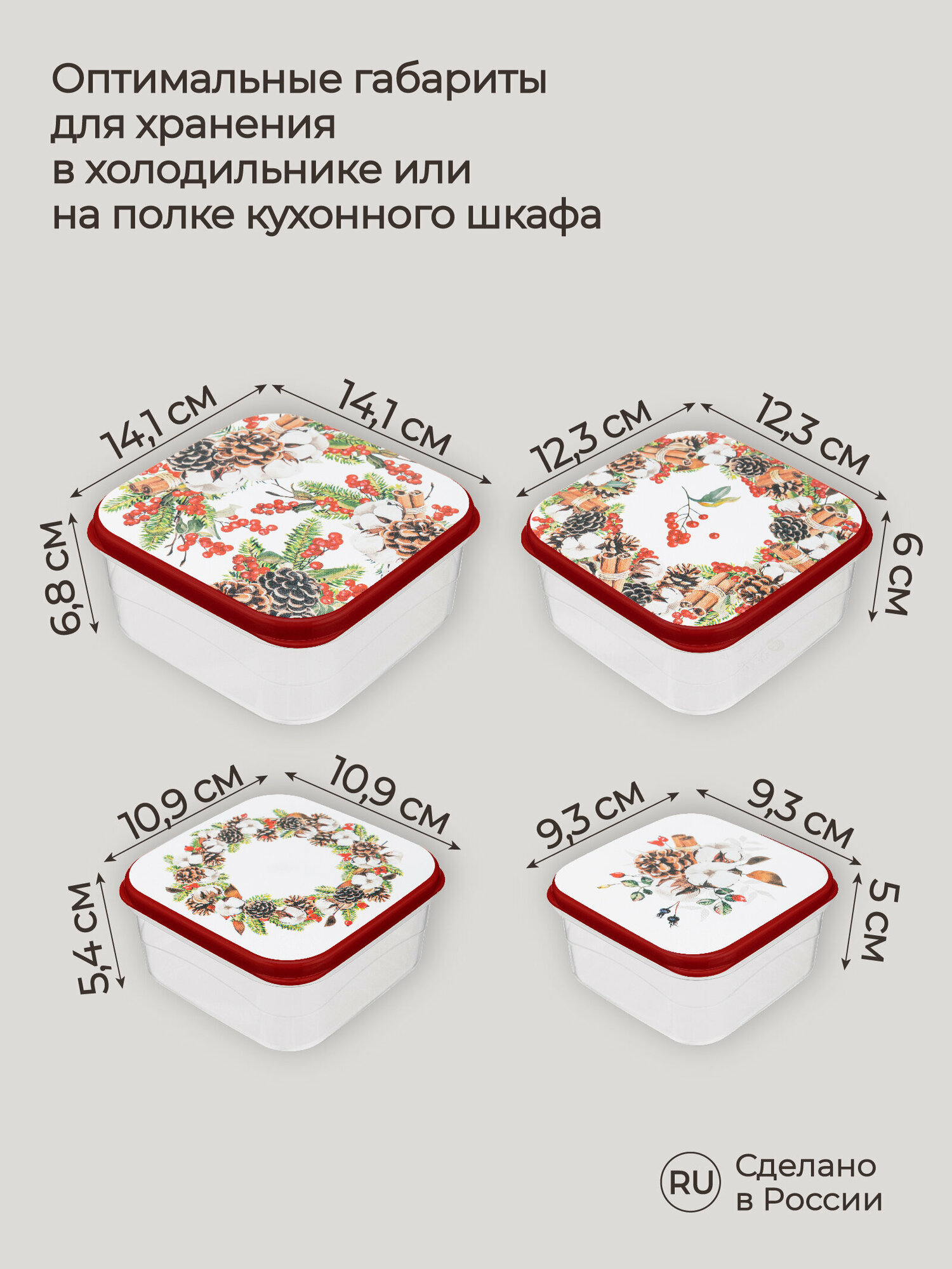 10 цен на Комплект контейнеров для продуктов с декором 4шт 0,3л+0,45л+0,65л+1л (Бордовый)
