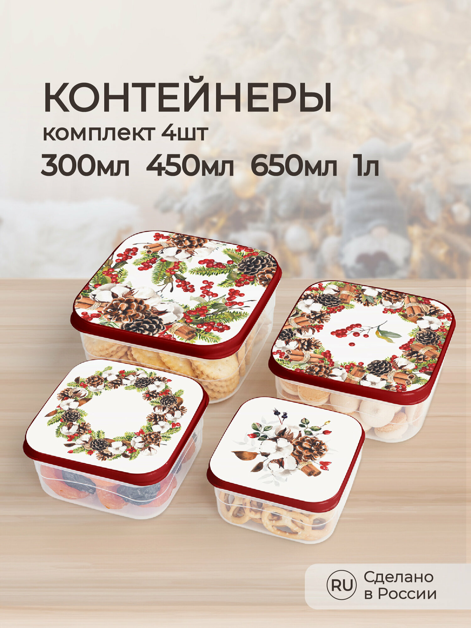 Комплект контейнеров для продуктов с декором 4шт 0,3л+0,45л+0,65л+1л (Бордовый) информация:
