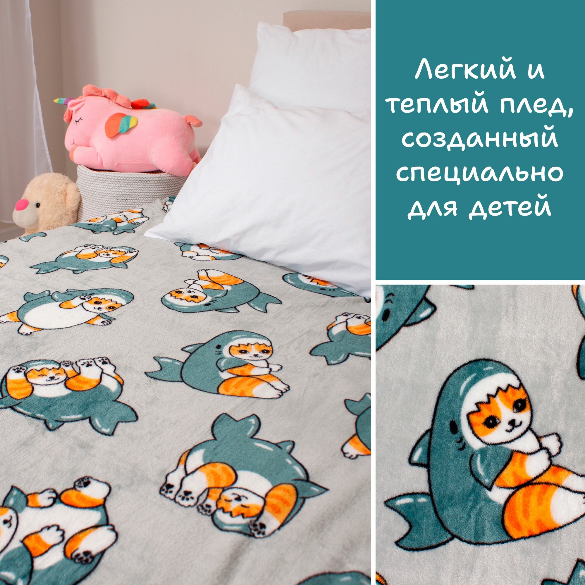 Отзывы на Детский плед из микрофибры с рисунком кот-акула, 150х200 см, серый