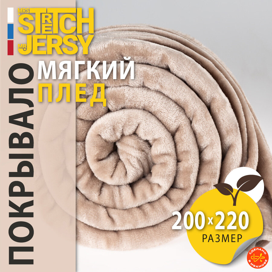 Плед-покрывало "Stretch Jersy" 200 x 220, мягкий и теплый, велсофт, бежевый информация:
