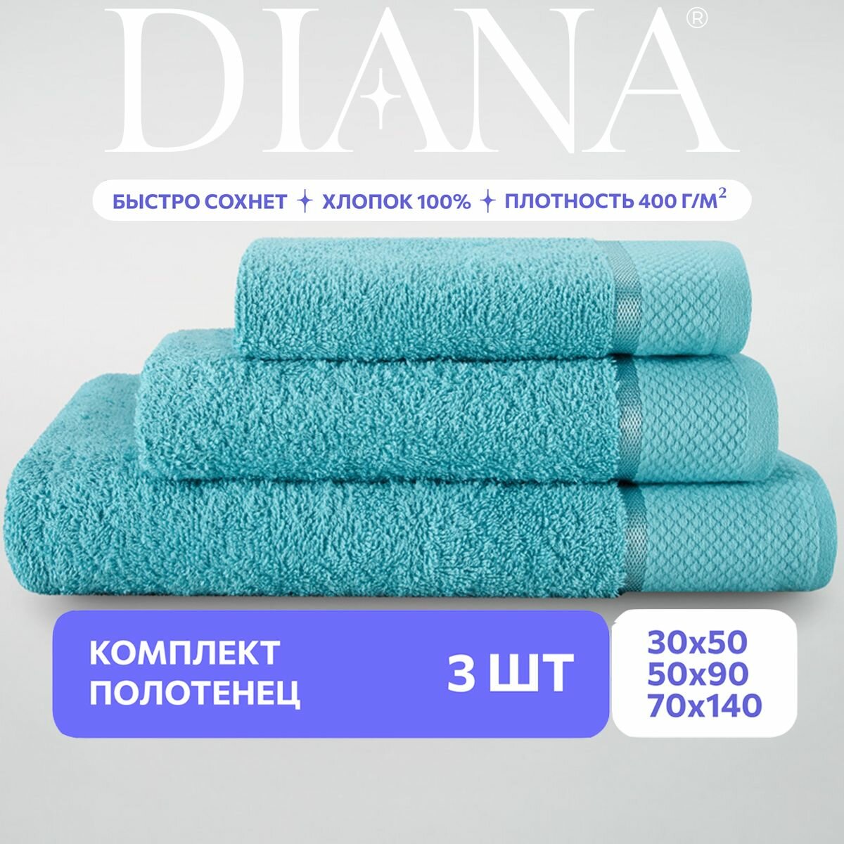 Набор полотенец махровых Diana, Авеню, 3 шт 30х50, 50х90, 70х140, 100% хлопок, Турмалин 900 ₽