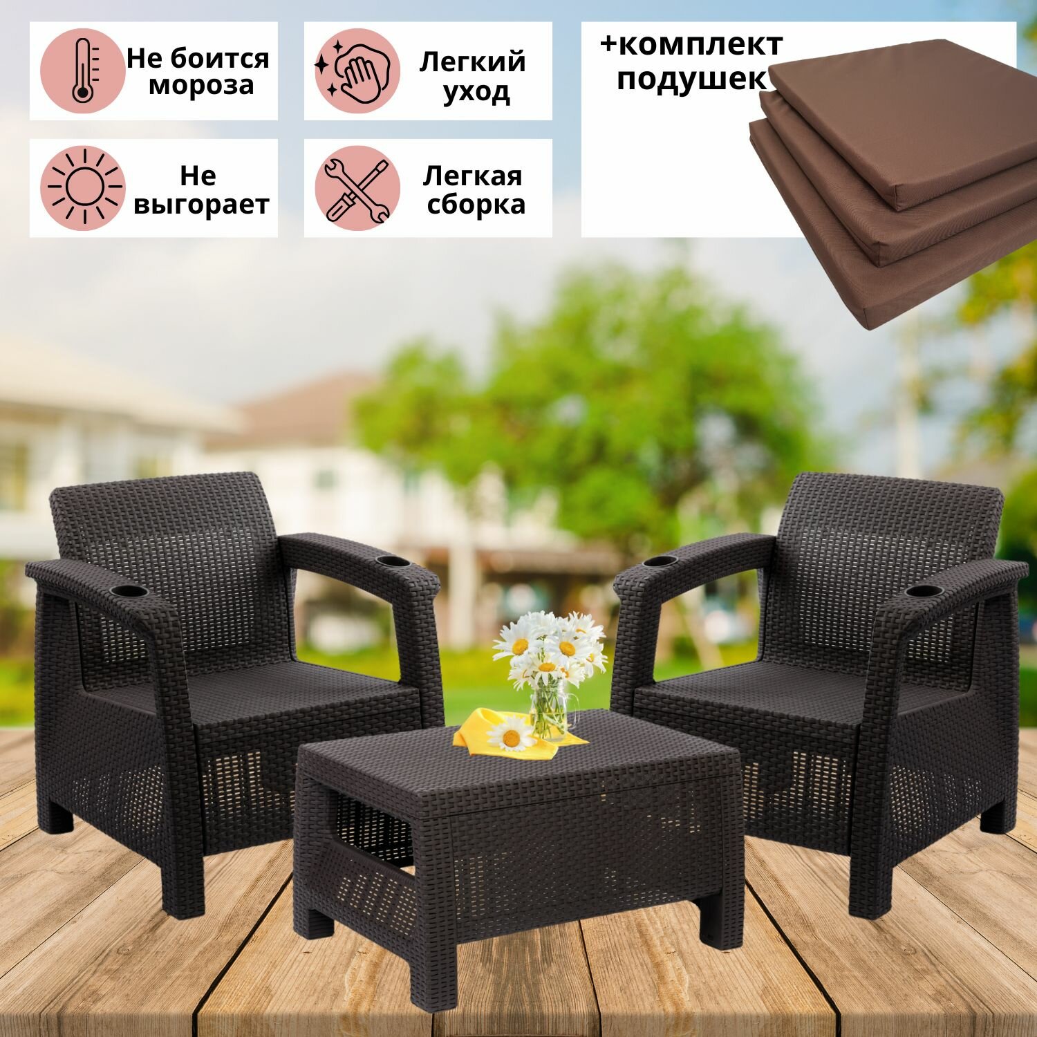 10 цен на Садовая мебель. Набор кофейный на 2 персоны (2 кресла + кофейный столик), мокко, с коричневыми подушками