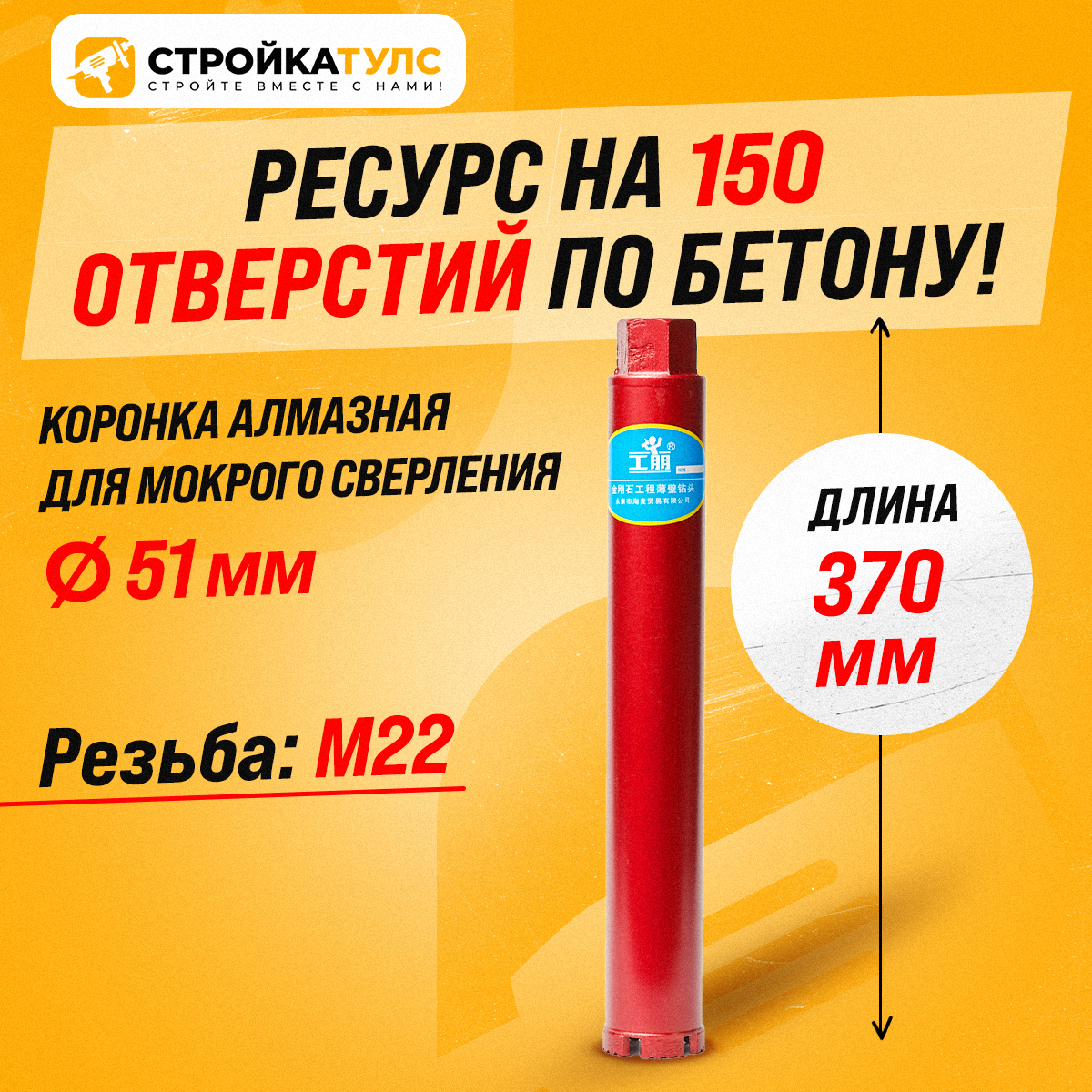 Отзывы на Коронка алмазная М22 51*370 мм мокрорез по бетону, кирпичу для сухого и мокрого бурения