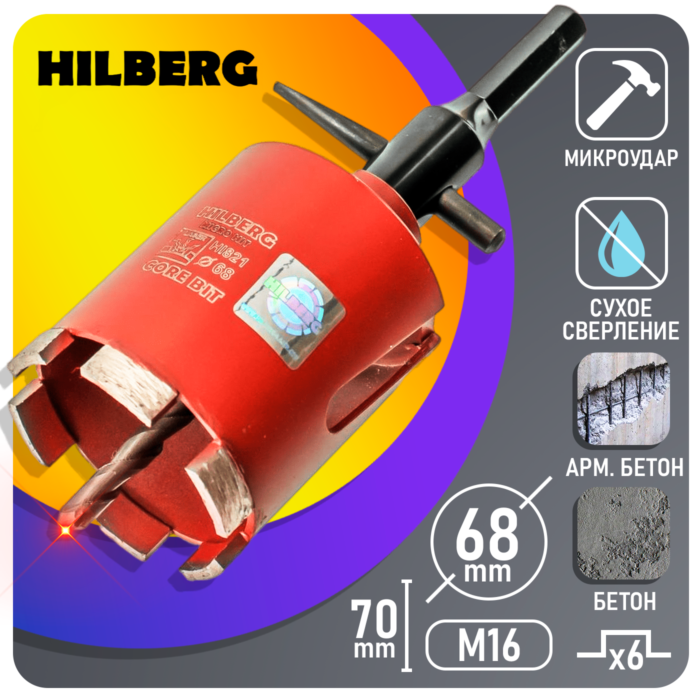 Алмазная Коронка с микроударом HILBERG HI821 Industrial Laser Micro Hit 6T 68мм ( по cильно армированному бетону)