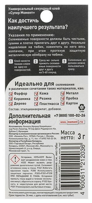 | Материалы для склеивания | бумага / дерево / керамика / кожа / металл / пластик / пробка / резина / ткань / фарфор |