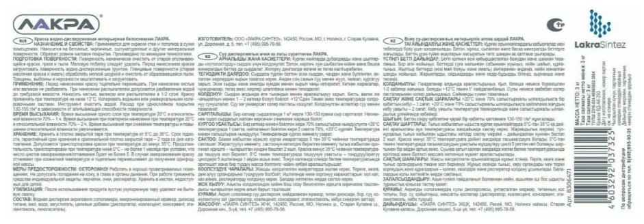 Краска интерьерная лакра белая матовая (3кг) информация: