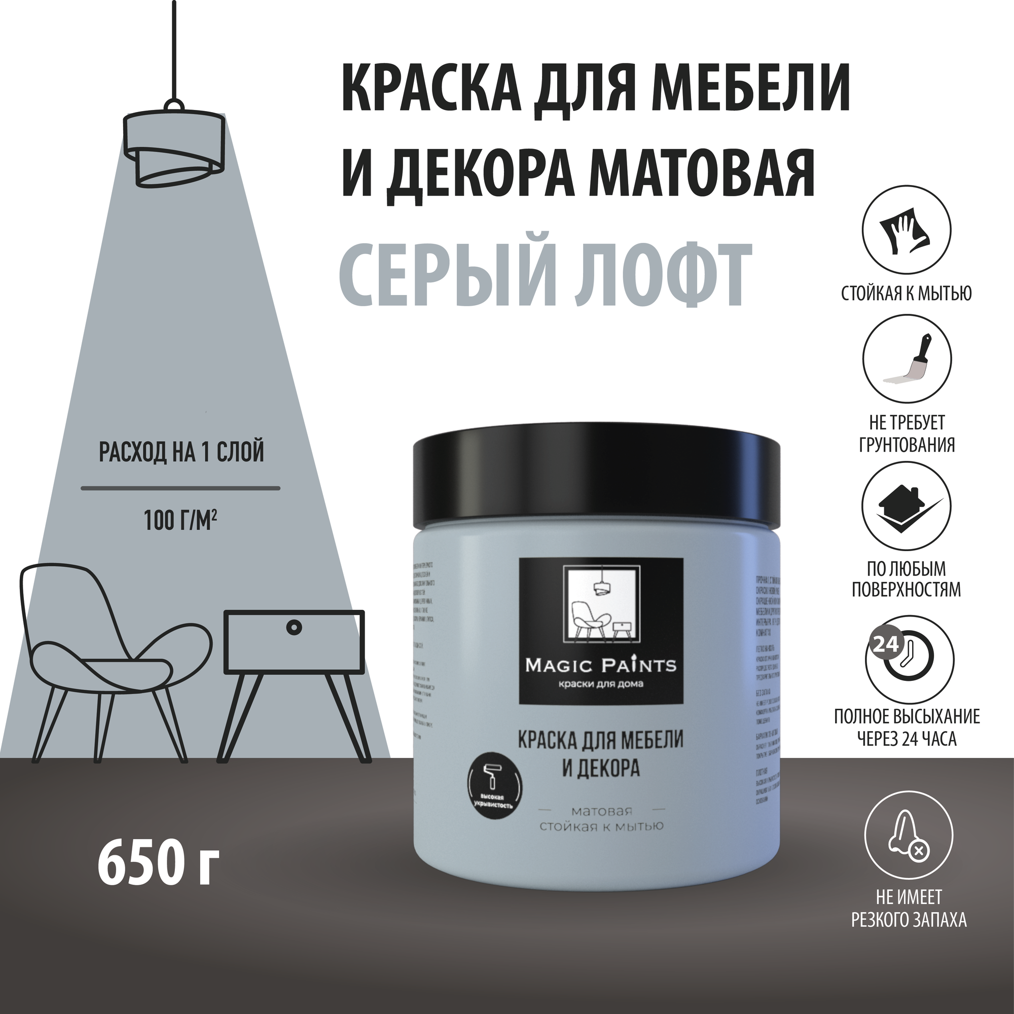 Матовая краска для мебели и декора Magic Paints без запаха для стен потолков дерева кухни кухонных фасадов дверей стекла цвет Серый лофт 0.65 кг информация: