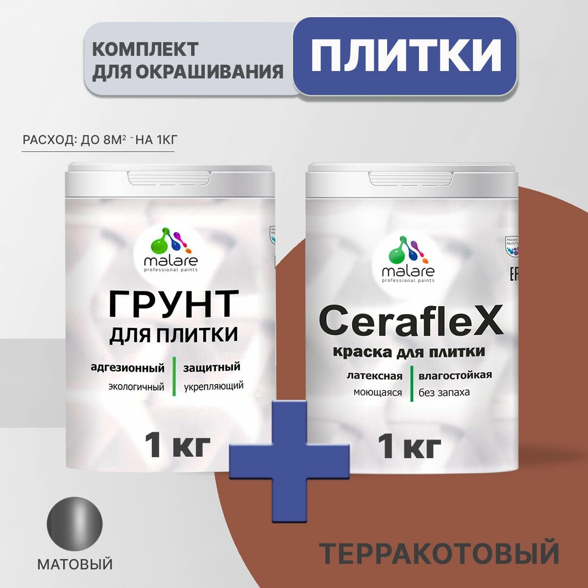 10 цен на Комплект Malare для окрашивания плитки и кафеля (1кг грунт + 1кг краска), акриловый, без запаха, быстросохнущий, матовый, цвет терракотовый