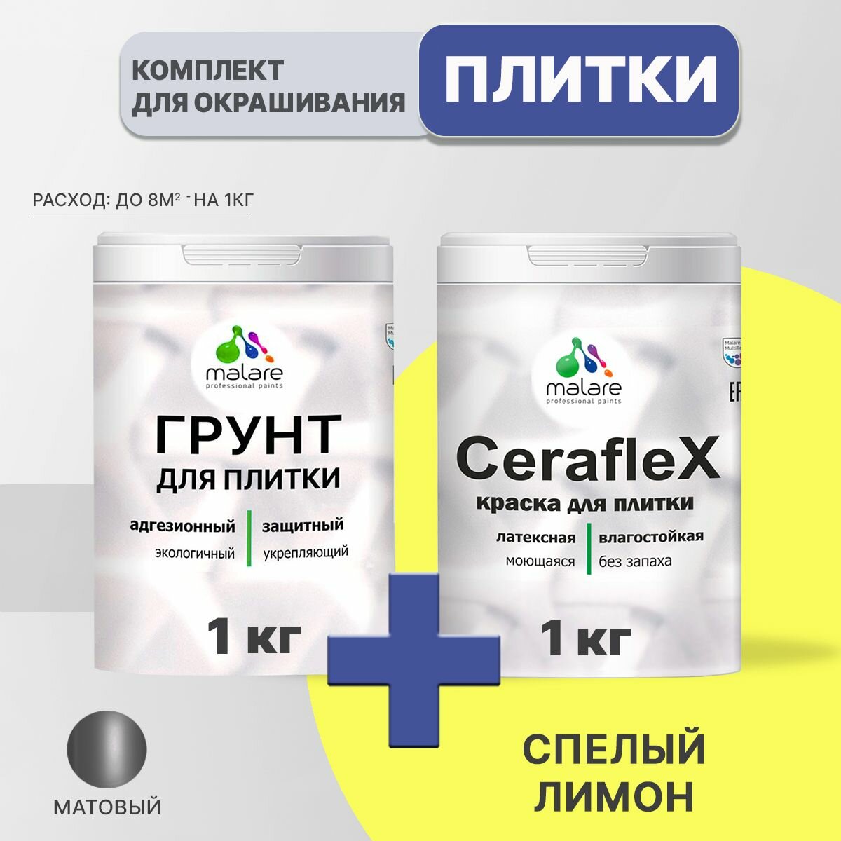 Комплект Malare для окрашивания плитки и кафеля (1кг грунт + 1кг краска), акриловый, без запаха, быстросохнущий, матовый, цвет спелый лимон информация: