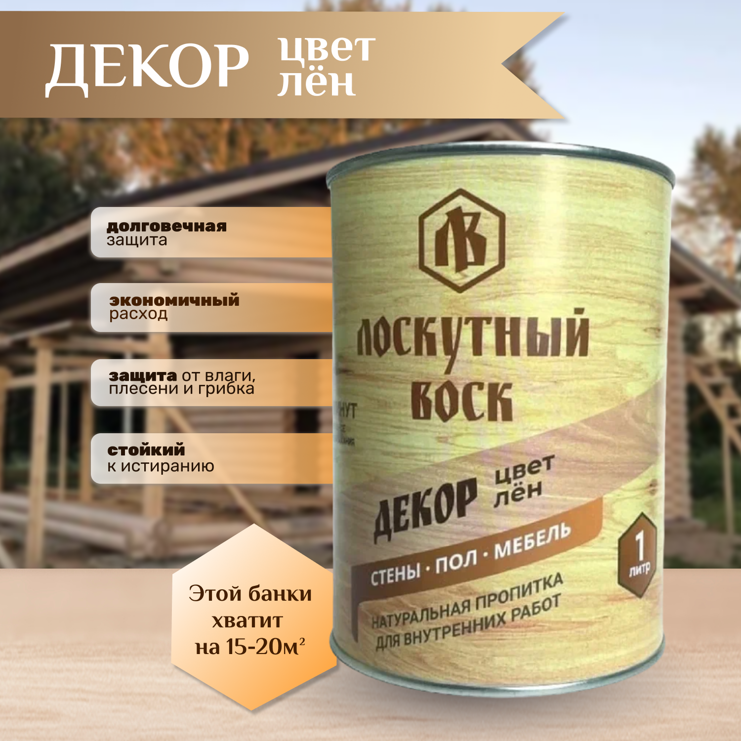 Влаго-биозащитная пропитка "Лоскутный воск декор", лён, 1л, железная банка