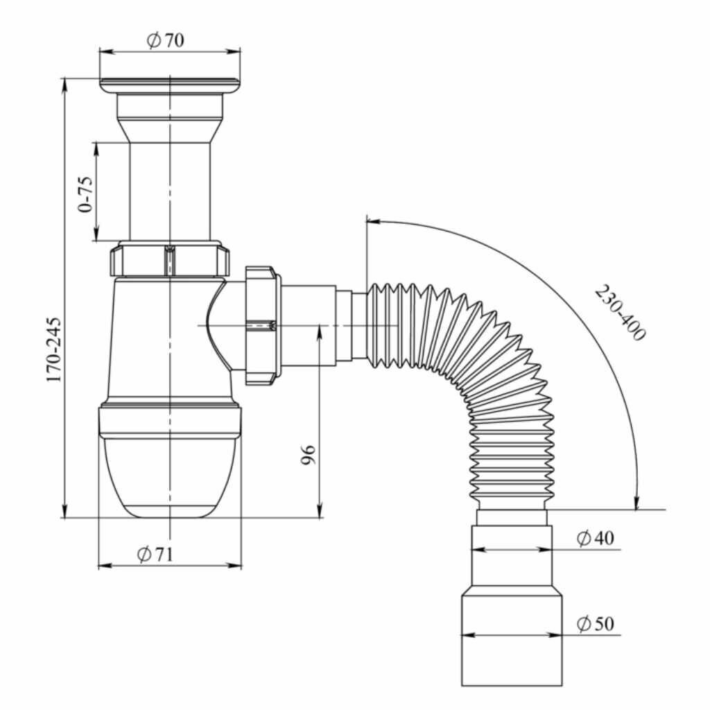 Сифон для мойки большая горловина с переливом, с отводом под сливной шланг и со съёмной корзинкой для мусора
