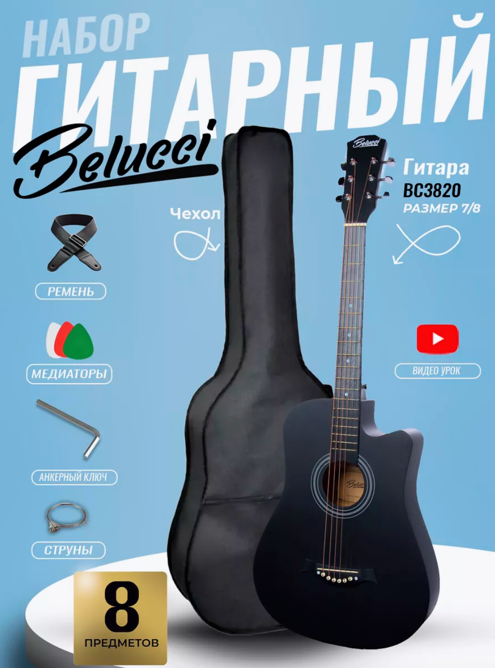 В комплекте: Акустическая гитара 7/8 Belucci BС3820 BK матовая, Чехол, Ремень, 6 Струн, Медиаторы,черная ,38 дюймов информация:
