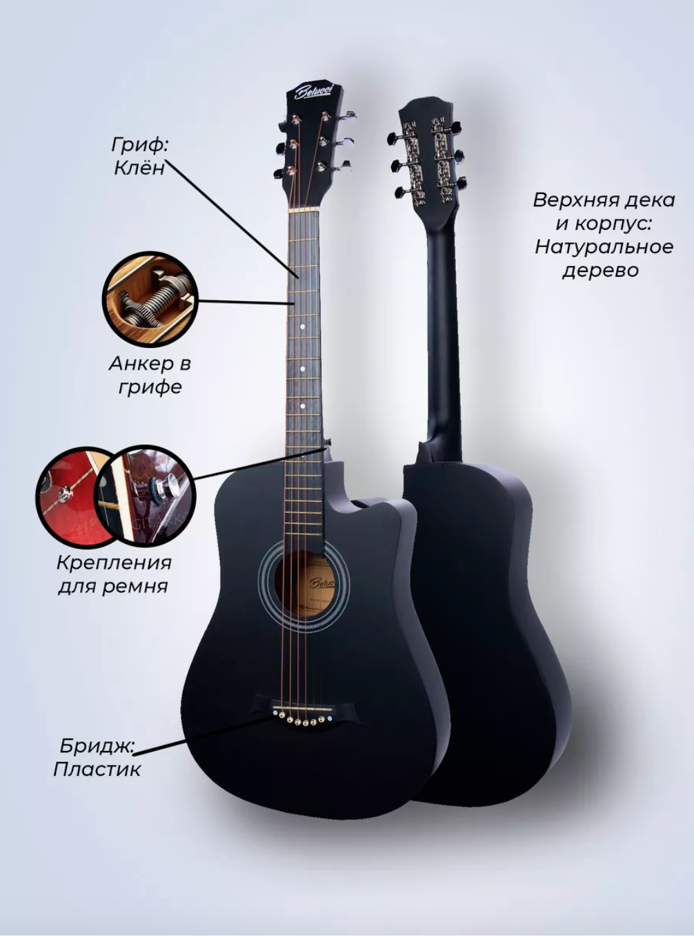 Чёрная Гитара акустическая глянцевая 38" В комплекте: Чехол, Ремень, 6 Струн, Медиаторы, Гитара Belucci BС3810