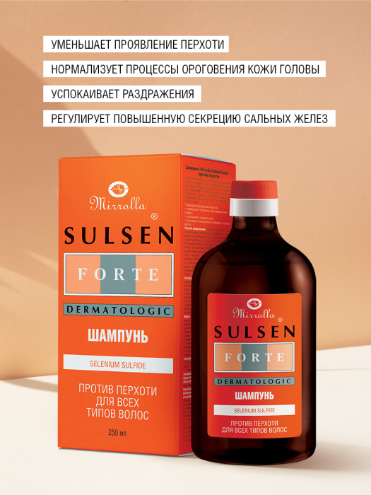 | Способ применения | намочить волосы. Нанести небольшое количество шампуня и распределить по всей длине волос. Вспенить шампунь и массировать в течение 2-3 минут. Смыть большим количеством воды. При попадании в глаза немедленно промойте водой. Использовать через день в течение 4-6 недель, после чего перейти на регулярное применение дерматологически мягкого шампуня «Mirrolla Sulsen Mite» еще в течение 1,5-2 месяцев. Повторять курс по необходимости. Для усиления эффекта рекомендуется применять вместе с пастой «Mirrolla Sulsen Forte» |