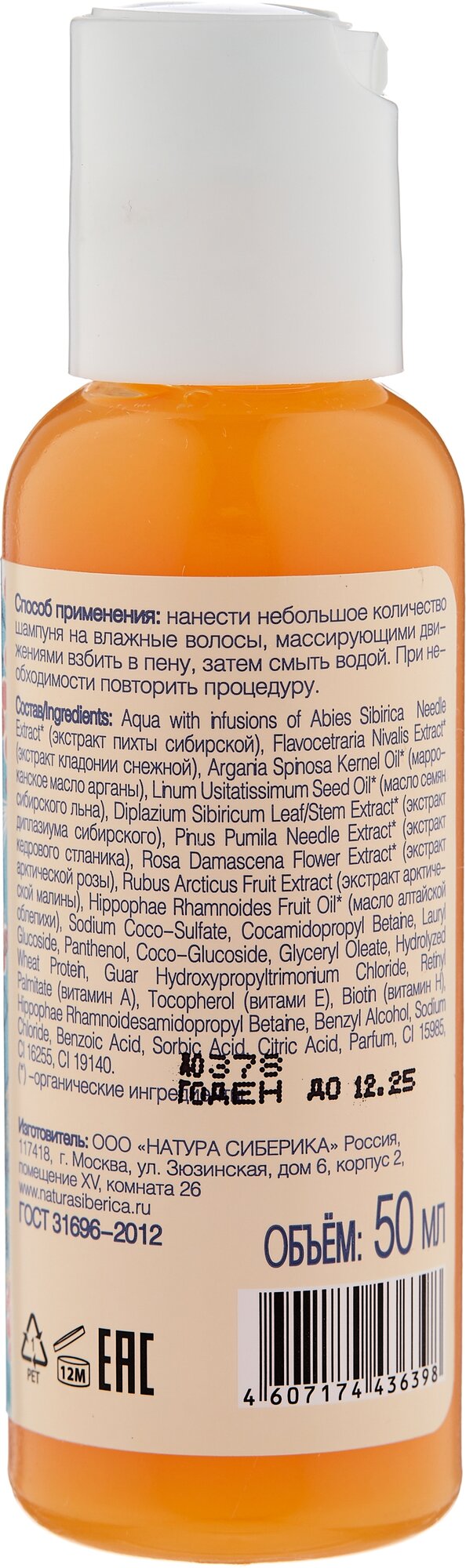 | Состав | aqua with infusions of: abies sibirica needle extract (экстракт пихты сибирской), cetraria nivalis extract (экстракт кладонии снежной), argania spinosa kernel oil (марроканское масло арганы), linum usitatissimum (linseed) seed oil (масло семян сибирского льна), diplazim sibiricum extract (экстракт диплазиума сибирского), pinus pumila needle extract (экстракт кедрового стланника), rosa damascena flower extract (экстракт арктической розы), rubus idaeus seed extract (экстракт арктической малины), hippophae rhamnoides fruit oil (масло алтайской облепихи), sodium coco-sulfate, cocamidopropyl betaine, lauryl gluciside, panthenol, coco-glucoside, glyceryl oleate, hydrolyzed wheat protein, guar hydroxypropyltrimonium chloride, retinyl palmitate (витамин а), tocopherol (витамин e), biotin (витамин н), hippophae rhamnoidesamidopropyl betaine, benzyl alcohol, sodium chloride, benzoic acid, sorbic acid, citric acid, parfum |