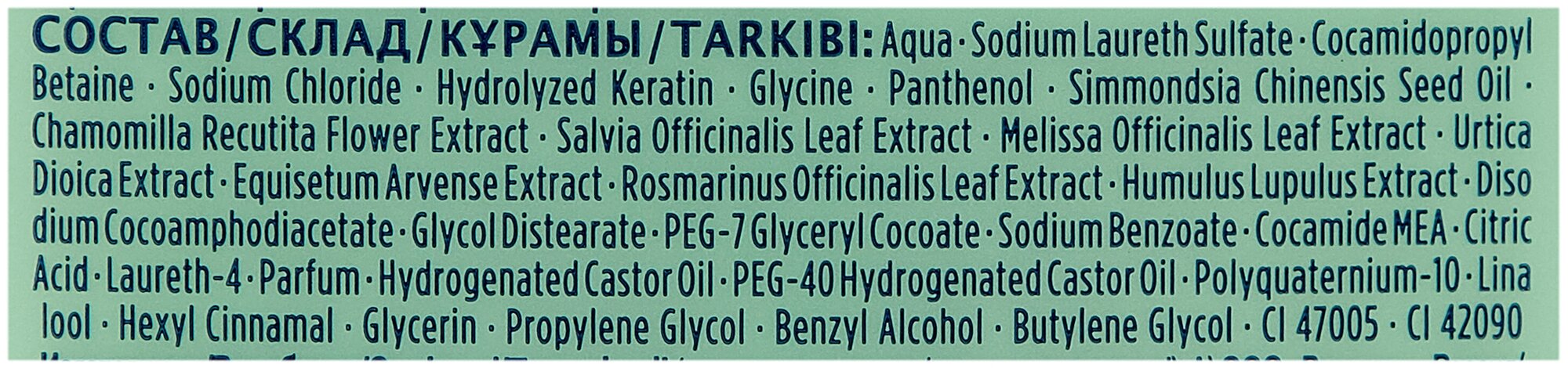 | Состав | aqua, sodium laureth sulfate, cocamidopropyl betaine, sodium chloride, hydrolyzed keratin, glycine, panthenol, simmondsia chinensis seed oil, chamomilla recutita flower extract, salvia officinalis leaf extract, melissa officinalis leaf extract, urtica dioica extract, equisetum arvense extract, rosmarinus officinalis leaf extract, humulus lupulus extract, disodium cocoamphodiacetate, glycol distearate, peg-7 glyceryl cocoate, sodium benzoate, cocamide mea, citric acid, laureth-4, parfum, hydrogenated castor oil, peg-40 hydrogenated castor oil, polyquaternium-10, linalool, hexyl cinnamal, glycerin, propylene glycol, benzyl alcohol, butylene glycol, ci 47005, ci 42090 |