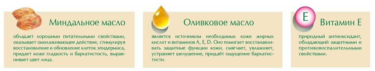 | Масла и экстракты | гидрогенизированное касторовое масло / масло авокадо / масло граната / масло персиковое / миндальное масло / оливковое масло / экстракт алоэ вера / экстракт граната / экстракт женьшеня / экстракт зеленого чая / экстракт календулы / экстракт облепихи / экстракт огурца / экстракт оливы / экстракт ромашки |