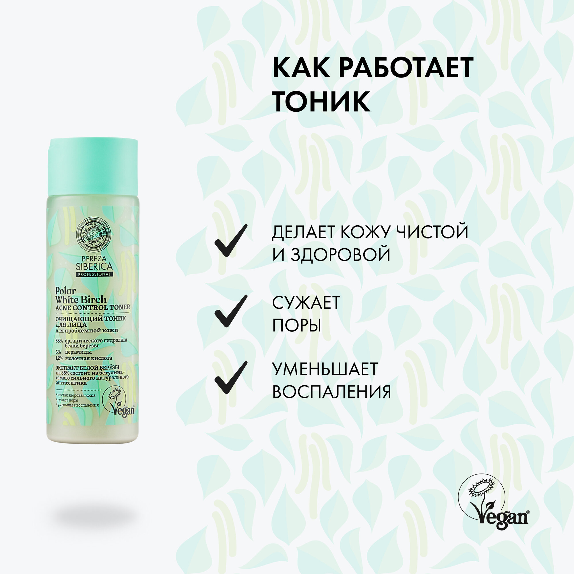 | Дополнительная информация | Очищающий тоник для лица очищает и сужает поры, успокаивает, делая кожу чистой и здоровой, готовит ее к последующему нанесению средств ухода, Белая полярная береза содержит в несколько раз больше бетулина, чем береза, растущая в средних широтах, А высокие концентрации витаминов B2 и B5 оказывают сильное успокаивающее действие, препятствуют потере влаги, осветляют несовершенства и выравнивают тон кожи, БЕТУЛИН известен своим мощным противовоспалительным действием, он эффективно успокаивает раздражения, сужает расширенные поры, препятствует возникновению акне и усиливает иммунные свойства кожи, одновременно увлажняя и поддерживая здоровый баланс, Церамиды – поддерживают оптимальный гидролипидный баланс в коже, защищают от потери влаги, мягко стимулируют процессы восстановления, Молочная кислота – очищает поры и препятствует образованию черных точек, осветляет следы постакне, выравнивая тон кожи. |