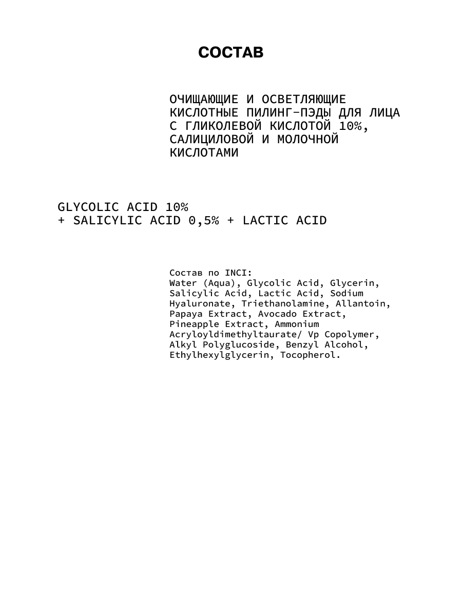 | Состав | Water (Aqua), Glycolic Acid (гликолевая кислота), Glycerin, Salicylic Acid (салициловая кислота), Lactic Acid (молочная кислота), Sodium Hyaluronate (гиалуронат натрия), Triethanolamine, Allаntoin (аллантоин), Papaya Extract (экстракт папайи), Avocado Extract (экстракт авокадо), Pineapple Extract (экстракт ананаса), Ammonium Acryloyldimethyltaurate/Vp Copolymer, Alkyl Polyglucoside, Benzyl Alcohol, Ethylhexylglycerin, Tocopherol. |
