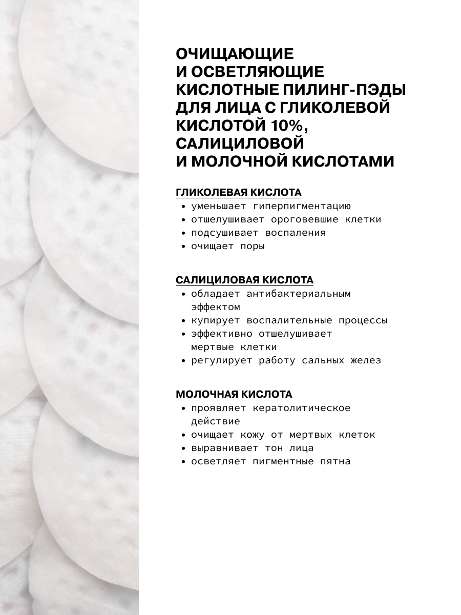 10 цен на ART&FACT. / Очищающие и осветляющие кислотные пилинг-пэды для лица с гликолевой кислотой 10%, салициловой и молочной кислотами, 115 мл