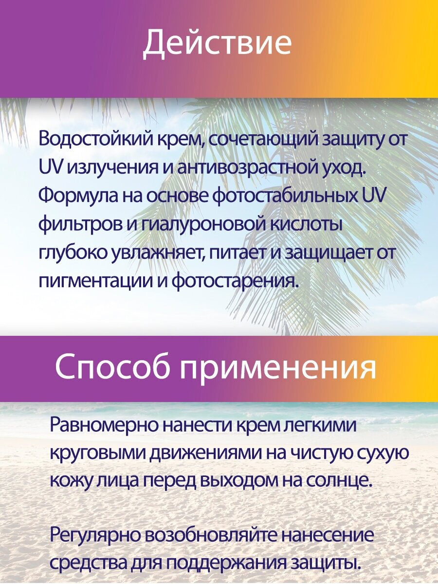 | Способ применения | равномерно нанести крем легкими круговыми движениями на чистую сухую кожу лица перед выходом на солнце. Регулярно возобновляйте нанесение средства для поддержания защиты |