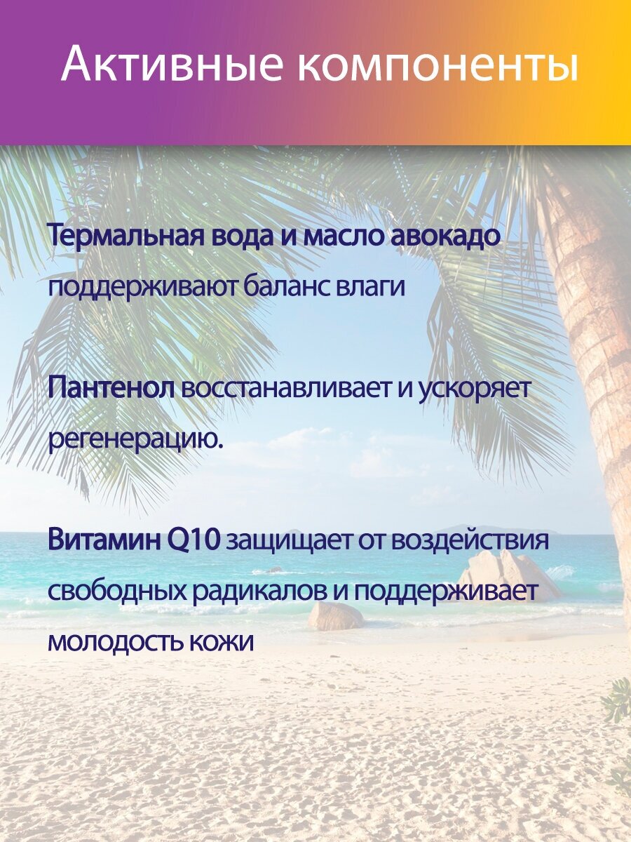 | Состав | aqua, prunus persica kernel oil, persea gratissima oil, octocrylene, ethylhexyl methoxycinnamate, ethylhexyl salicylate, butyl methoxydibenzoylmethane, benzophenone-3, prunus amygdalus dulcis oil, olea europaea fruit oil, butyrospermum parkii butter, cetearyl alcohol, glyceryl stearate, ubiquinone, panthenol, polyquaternium-37, hyaluronic acid, benzyl alcohol, parfum |